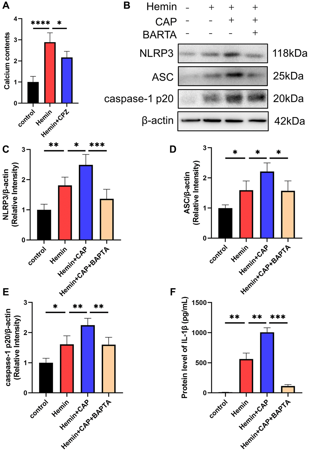 Given TRPV1’s essential role in regulating calcium homeostasis and the involvement of calcium in NLRP3 inflammasome activation, calcium was introduced to investigate the underlying mechanism by which TRPV1 induced NLRP3 inflammasome activation. The calcium content of microglia was dramatically increased when stimulated with hemin, while it was reduced when treated with CPZ (Figure 6A). Chelation of calcium via BAPTA-AM reversed the increased levels of NLRP3, ASC, caspase-1 p20, and IL-1β induced by hemin (Figure 6B–6F).