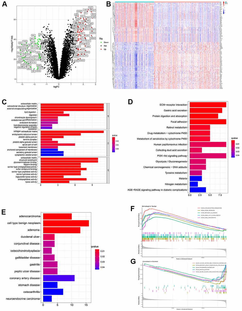 After batch normalization and differential gene analysis, 60 down-expressed genes and 71 up-expressed genes was identified (Supplementary Table 1 and Figure 2A, 2B). In GO analysis, some cancer-related terms, including “extracellular matrix organization”, “lipid digestion”, “serine-type endopeptidase activity” were identified as enriched terms (Figure 2C). In KEGG (Kyoto Encyclopedia of Genes and Genomes) analysis, the cancer-associated pathway, like “ECM-receptor interaction”, “Focal adhesion”, “PI3K-Akt signaling pathway”, “Glycolysis/Gluconeogenesis”, “Chemical carcinogenesis - DNA adducts” was enriched (Figure 2D). In DO analysis, “adenocarcinoma”, “cell type benign neoplasm”, “neuroendocrine carcinoma” was identified (Figure 2E). “KEGG_ECM_RECEPTOR_ INTERACTION”, “KEGG_FOCAL_ADHESION”, “KEGG_PATHWAYS_IN_CANCER” were identified in tumor samples of PDAC patients. “KEGG_GLYCINE_SERINE_AND_THREONINE_METABOLISM”, “KEGG_PROTEIN_EXPORT” and some other pathways were identified using GSEA in normal samples of PDAC patients (Figure 2F, 2G and Supplementary Table 2).