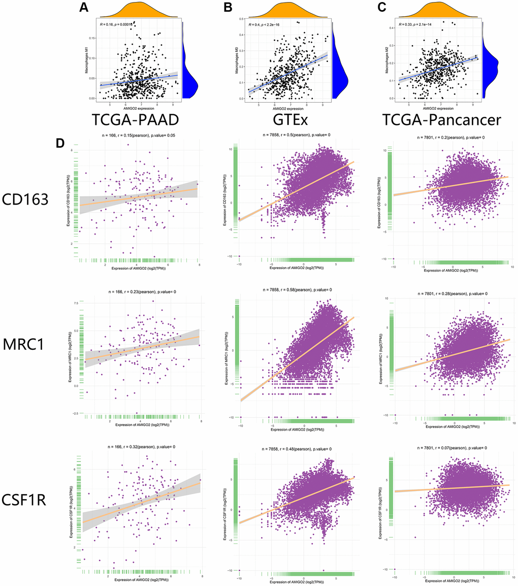 As shown in Figure 6A–6D, the correlations between AMIGO2 expression and M0 and M2 macrophages are significantly higher than the correlation between AMIGO2 expression and M1 macrophage. Then three biomarkers of M2 macrophage (CD163, MRC1, CSF1R) was chosen to identify the correlation between AMIGO2 expression and M2 macrophage in large scale of high-throughput data. AMIGO2 expression is significantly correlated to the polarization of M2 macrophage in pancancer datasets, PDAC datasets and normal tissue datasets.