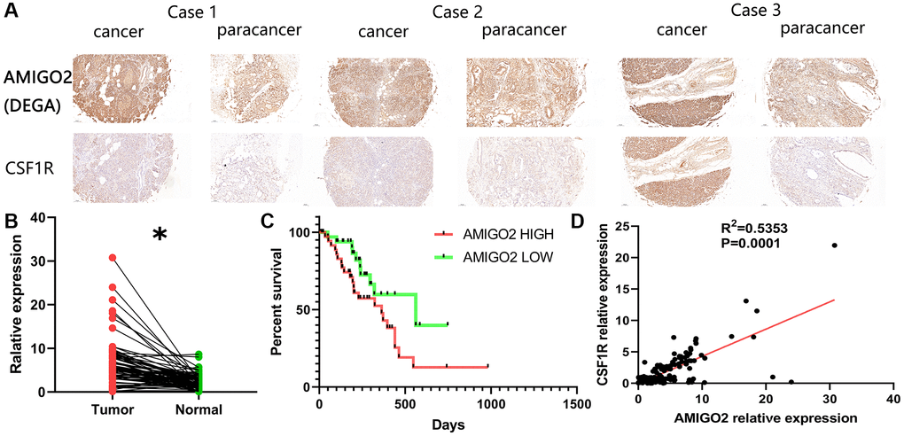 Then, our local cohort with 80 PDAC patients was enrolled in the current study. Specifically, the 80 clinical samples were divided into high-risk group (AMIGO2 high) and low risk group (AMIGO2 low) according to the median expression level of AMIGO2 (Table 1). Immunohistochemical imagines of cancer and paracancer shows AMIGO2 and CSF1R are up-regulated on PDAC tissue compare to paracancer tissue (Figure 7A). AMIGO2 is significantly up-regulated on PDAC tissue in our cohort (Figure 7B) according to our qPCR results. Up-regulated AMIGO2 also indicates poor clinical outcomes in our current cohort (Figure 7C). Interestingly, a robust correlation between the expression of CSF1R and AMIGO2 in cancer and paracancer tissue are also identified (Figure 7D).