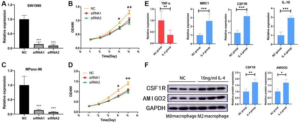 Then, AMIGO2 siRNA was successfully transfected in two Pancreatic ductal adenocarcinoma cell lines, SW1990 and MPanc-96 (Figure 8A, 8C). CCK8 assay shows knock out of AMIGO2 restrains the proliferation of Pancreatic ductal adenocarcinoma cell (Figure 8B, 8D). After inducing M2 polarization of macrophages by adding IL-4 in RAW264.7 cell, the mRNA expression of TNF-α (biomarker of M1 macrophage) in IL-4 treated group is significantly decreased compared to untreated group (NC group, P < 0.01), and the mRNA expression of M2 macrophage biomarkers, including IL-10, CSF1R and MRC1 in IL-4 treated group is significantly increased compared to untreated group (NC group, Figure 8E, P < 0.01). After confirmation of IL-4 induced M2 macrophage, the protein level of M2 polarization biomarker, CSF1R, and AMIGO2 was detected in M2 macrophages (IL-4 treated group) and M0 macrophages (NC group). The expression of CSF1R and AMIGO2 was significantly increased in M2 macrophages (Figure 8F, p < 0.05).