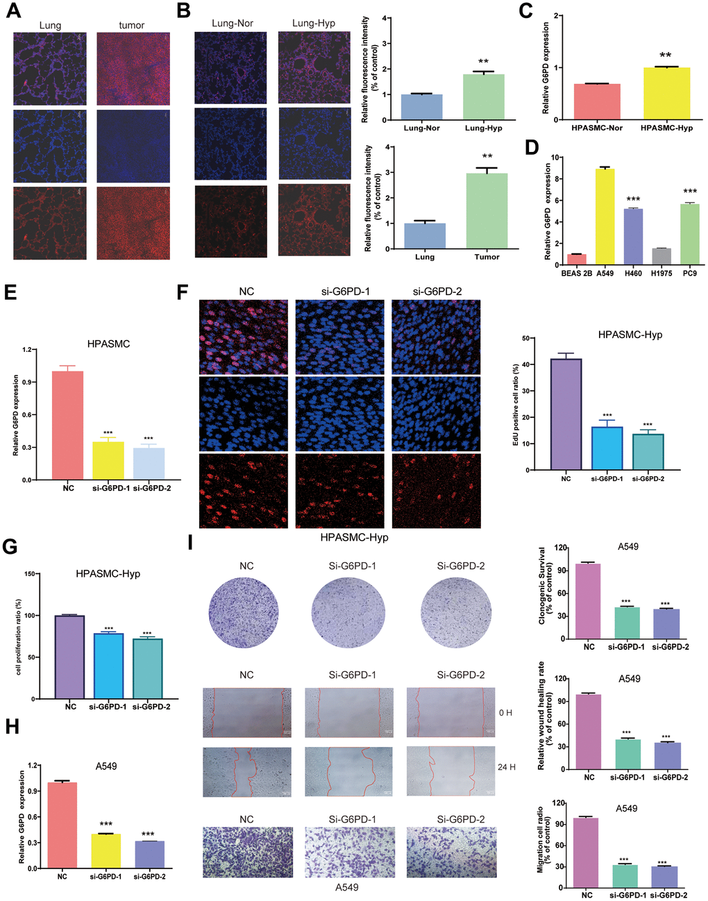 We measured the protein level of G6PD in the tumor tissues and lung organs from BALB/c nude mice by immunofluorescence, and hypoxia-induced PAH tissue and normal lung tissue from the (SD) rats and mice by immunofluorescence. The results indicated that G6PD had a higher level in tumor tissues than lung tissue and a higher level in hypoxia-induced PAH tissues than normal lung tissue (Figure 10A, 10B and Supplementary Figure 2). WB experiment showed that the levels of G6PD increased in tumor tissues than in lung tissue. Similarly, the levels of G6PD increased in hypoxia-induced PAH tissues than in normal lung tissue (Supplementary Figure 3). Subsequently, we performed qRT-PCR, and the result demonstrated that G6PD was significantly over-expressed in LUAD cell lines (A549, H1975, H460, PC9) in comparison to normal BEAS 2B cells (Figure 10D). Meanwhile, G6PD was over-expressed in hypoxia-treated HPASMCs in comparison to normal HPASMCs (Figure 10C).