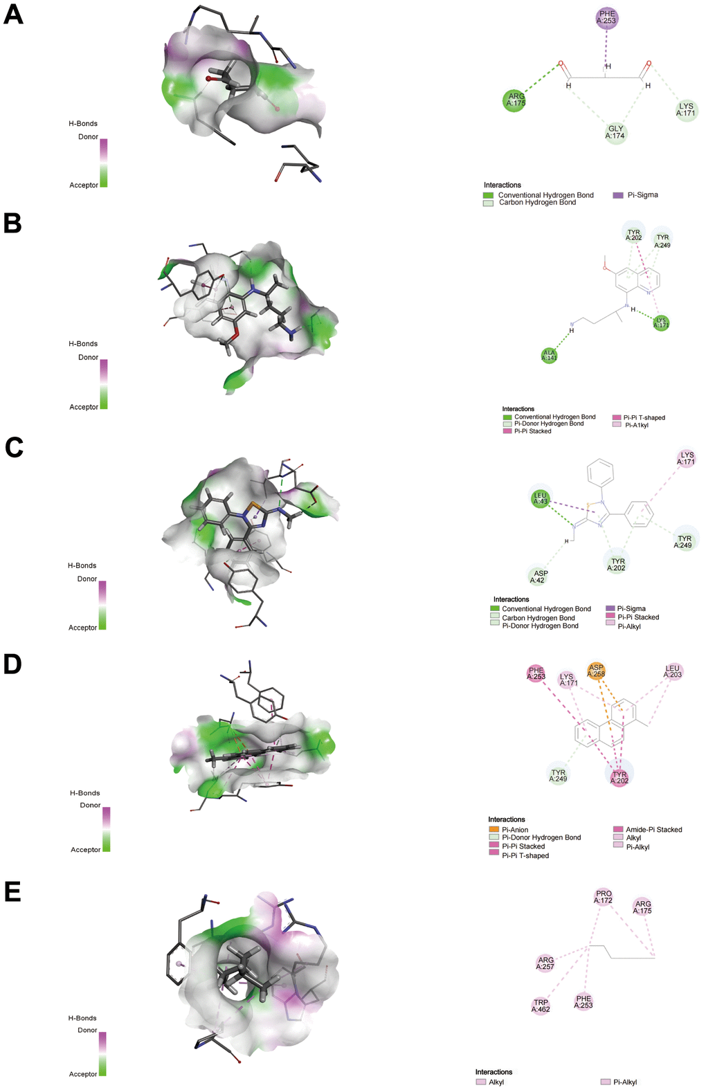 We applied the Enrichr platform to identify the potential drug molecules of G6PD based on the DSigDB database. After ranking these drug molecules through the adjusted P-value, the top five molecules were screened out. They were glutaraldehyde, PRIMAQUINE, SCH-202676 hydrobromide, 1-METHYLPHENANTHRENE, and HEXANE, respectively, as shown in Table 2. Notably, glutaraldehyde and PRIMAQUINE had a higher combined score. To find the binding affinity of G6PG to the top 5 drug molecules, we performed molecular docking and found that G6PD might have an interaction with these drug molecules, resulting in the -CDOCKER energies of 22.9402, 17.5646, 6.69146, -0.169687, and 17.1697 kcal/mol (Table 3). The results suggested that glutaraldehyde had a stronger binding ability. G6PD had a conventional hydrogen bond with ARG175 of glutaraldehyde, carbon-hydrogen bonds with GLY174 and LYS171, and a Pi-sigma interaction with PHE253. The interaction with PRIMAQUINE includes conventional hydrogen bonds with ALA141 and LYS171 and Pi-donor hydrogen bonds with TYR202 and TYR249. The results of SCH-202676 hydrobromide are related to a conventional hydrogen bond (LEU43), a carbon-hydrogen bond (ASP42), Pi-donor hydrogen bonds (TYR202 and TYR249), and a Pi-alkyl interaction (LYS171). The results of 1-METHYLPHENANTHRENE are mainly associated with Pi-anion (ASP258) and Pi-donor hydrogen bonds (TYR249). The results of HEXANE showed that it interacted with the G6PD proteins via alkyl (Figure 11).