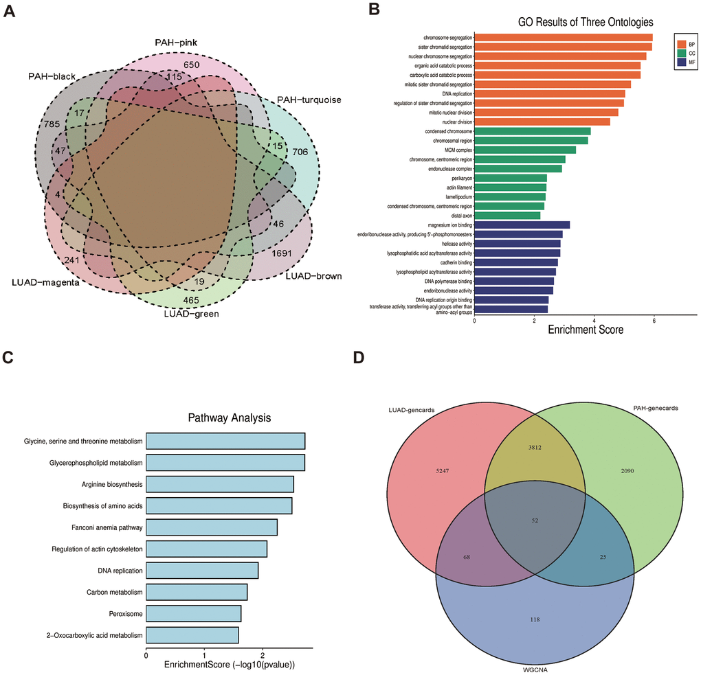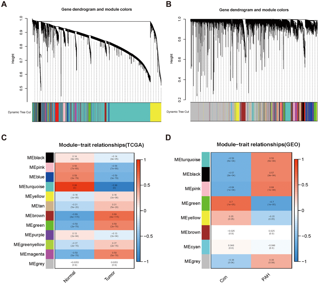Twelve modules were generated in TCGA by WGCNA, and different colors represented different modules. Then, we mapped the heat map which could assess the association between modules and the disease based on the Spearman correlation coefficient (Figure 2A, 2C). We selected the modules “magenta,” “green,” and “brown” as LUAD-related modules, which were highly positively correlated with LUAD (magenta module: r = 0.59, p = 5e−78, genes = 245; green module: r = 0.59, p = 2e−78, genes = 516; brown module: r = 0.69, p = 4e−115, genes = 1899). Similarly, eight modules were identified in GSE113439, and the module “black” (r = 0.57, p = 9e−04, genes = 853), “pink” (r = 0.64, p = 1e−04, genes = 784) and “turquoise” (r = 0.58, p = 6e−04, genes = 767) were highly positively related to PAH (Figure 2B, 2D).