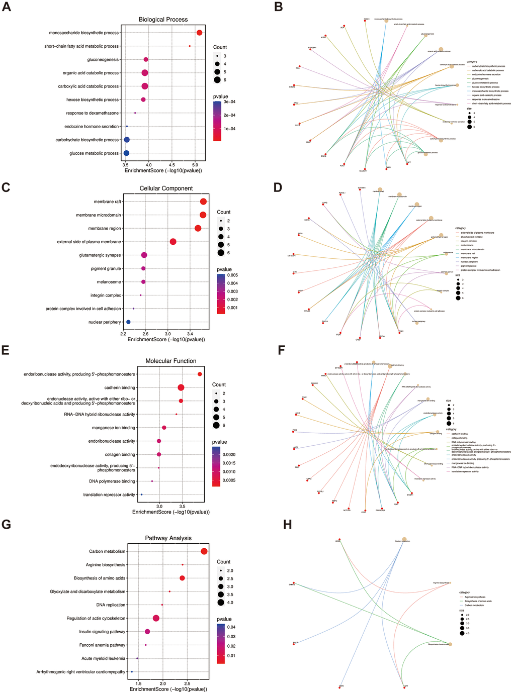 As for the 52 overlapped genes, we found they were associated with several metabolisms, such as monosaccharide biosynthetic process, gluconeogenesis, and short-chain fatty acid metabolic process by GO terms (Figure 4A, 4C, 4E), while enriched KEGG pathway enrichment entries contained carbon metabolism, arginine biosynthesis and biosynthesis of amino acids, etc. (Figure 4G). Moreover, the cnetplots were used for the specific GO terms and KEGG categories (Figure 4B, 4D, 4F, 4H). We noted that GO functions were significantly enriched in metabolism lay compared to the previous enrichment analyses of shared genes in LUAD and PAH.