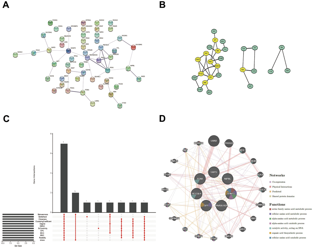 For a further selection of the hub gene in LUAD and PAH, A PPI network was constructed utilizing Cytoscape software with the confidence interaction score exceeding 0.4 (Figure 5A, 5B). To understand the interactions among the key gene, CytoHubba’s 12 algorithms were applied to calculate 7 hub genes including G6PD, F1N1, RECQL4, GPT, RNASEH2A, SHMT2, and NIPBL (Figure 5C). The co-expression network and associated functions of the seven hub genes were analyzed by the GeneMANIA database. The complex PPI network of seven hub genes included co-expression, physical interaction, prediction, and shared protein structural domains with percentages of 41.08%, 39.10%, 13.30%, and 6.52%, respectively (Figure 5D).