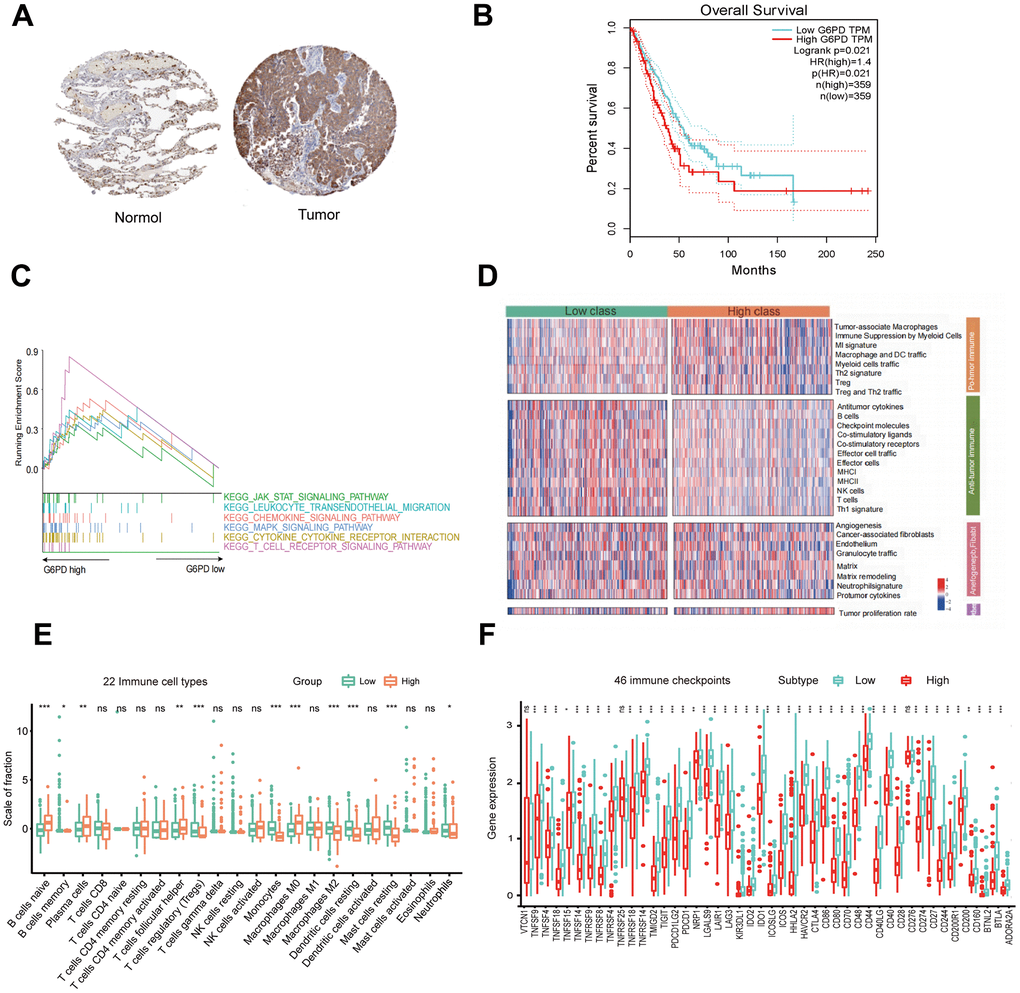 To further identify the key gene, we analyzed the 7 hub genes between cases and controls on discovery cohorts. As shown in Figure 6, three genes were selected, including G6PD, RECQL4, and RNASEH2A. Meantime, G6PD, GPT, NIPBL, and RNASEH2A were found in validation cohorts (Figure 7). Finally, we found that the GP6D was upregulated in both LUAD and PAH based on discovery and validation cohorts with P <0.05. In addition, GP6D had a higher expression in LUAD samples than normal samples through the HPA database (Figure 8A), and the high G6PD expression was related to an unfavorable overall survival (OS) (Figure 8B) by prognostic analysis. GSEA results showed that G6PD over-expression was related to immune-related pathways, such as the T cell receptor signaling pathway and chemokine signaling pathway (Figure 8C). Meanwhile, ssGSEA results indicated that G6PD was enriched in the immune-related pathway (Figure 8D). We found that G6PD participated in the immune regulation of human cancers via TISIDB database [40] (Supplementary Figure 1). Then, we investigated the degree of immune cell infiltration in 22 immune cell subpopulations with high and low G6PD gene expression using the CIBERSORT algorithm. CIBERSORT analysis revealed that the high expression group had significantly lower levels of memory B cells, regulatory T cells, monocytes macrophages M2, resting mast cells, and resting dendritic cells than those in the low group. However, the levels of naive B cells, plasma cells, follicular helper T cells, macrophages M0, and neutrophils were significantly higher than those in the low group (Figure 8E). Besides, we compared the expression levels of immune checkpoints between the G6PD high and low groups and further found that patients in the high group had increased the expression of TIGIT, CTLA4, CD40, CD274, and PDCD1, etc. (P < 0.001) (Figure 8F).
