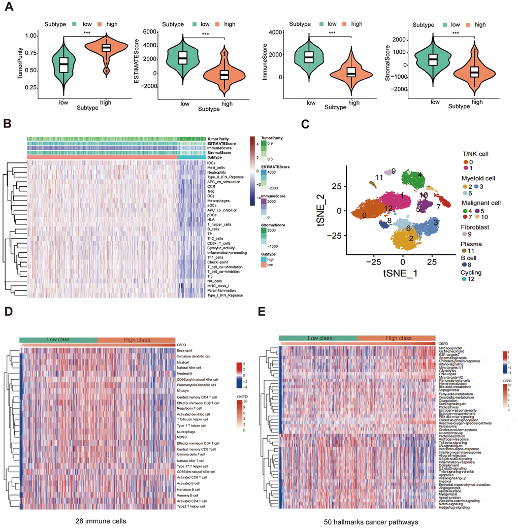 The results showed that the G6PD low group had greater ESTIMATE score, immune score, and stromal score levels (P < 0.001) (Figure 9A). We used the ssGSEA method to compare the TIME landscape in G6PD (Figure 9B). Therefore, we concluded that G6PD was possibly connected with TIME. We used the “Seurat” package to extract scRNA-seq data of LUAD patients from the GSE117570. Then, 13 immune cell clusters were found via the “FindNeighbors” and “FindClusters” functions. We screened the cell markers of the 13 clusters by the “FindAllMarkers” function. Single-cell analysis revealed that G6PD was significantly enriched in malignant cells, implying that malignant cells may cause the poor prognosis of LUAD patients (Figure 9C). ssGESA analysis revealed that most immune cells activity declined in the high-expression group, such as regulatory T cells and mast cells (Figure 9D). Moreover, G6PD was involved in many cancer-related signaling pathways, such as P53 signaling pathways and PI3K AKT signaling pathways (Figure 9E).