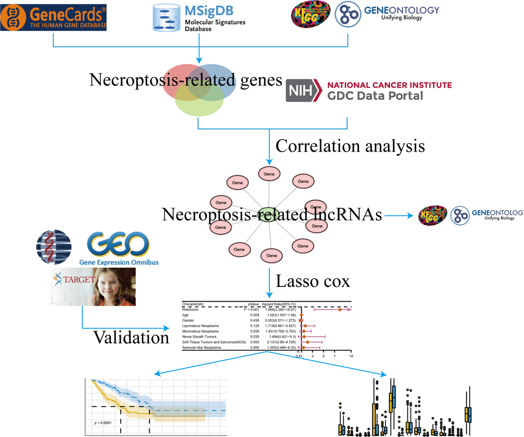 LncRNAs can be widely found in all types of tumors. Despite their inability to code proteins, lncRNAs contribute to the regulation of various tumor genes [16]. According to studies, lncRNAs have been found to be linked with necroptosis. For example, lncRNA PVT1 promotes hepatocellular necroptosis by increasing ZBP1 promoter methylation [17], and lncRNA 107053293 regulates necroptosis in chicken tracheal cells by antagonizing miR-148a-3p [18]. Furthermore, several evidences suggest that lncRNA may be important in the diagnosis and prognosis of tumors and may serve as a new target for future cancer treatment [19, 20]. Nonetheless, the predictive value and potential function of lncRNA on necroptosis of sarcoma cells are still incompletely well known. Therefore, it is imperative to thoroughly examine the association between NRlncRNAs and the sarcoma prognosis, along with their connection to the tumor immune microenvironment.