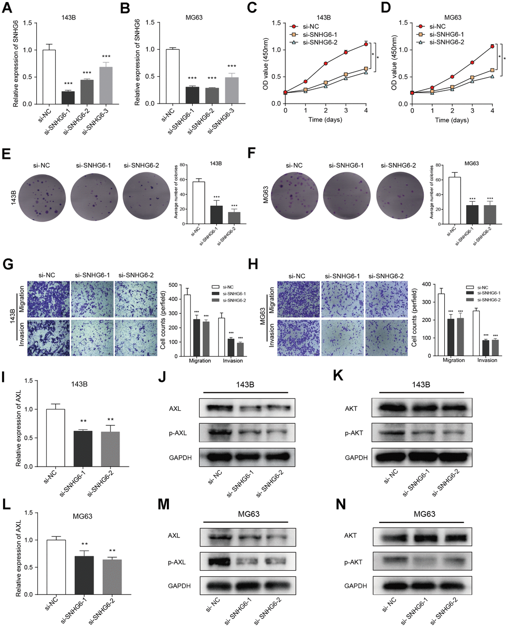 In order to investigate the regulation of NRlncRNAs on sarcomas, we explored the roles of NRlncRNA SNHG6 in osteosarcoma cell model. Firstly, we constructed three siRNA sequences (si-SNHG6-1, si-SNHG6-2 and si-SNHG6-3) targeting SNHG6 to attenuate the expression of SNHG6 and validated the transfection efficiency by qRT-PCR. Based on the findings, si-SNHG6-1 and si-SNHG6-2, which exhibited the most effective reduction in osteosarcoma cells 143B and MG63, were selected for further experiments (Figure 10A, 10B; *** P < 0.001). Next, we tested the viability of osteosarcoma cells with SNHG6 knockdown using CCK8 assay, finding that the viability was significantly decreased (Figure 10C, 10D; * P < 0.05). Furthermore, the colony formation assay demonstrated reduction in the colony-forming abilities of 143B and MG63 cells after SNHG6 knockdown (Figure 10E, 10F; *** P < 0.001). In order to further investigate the impact of SNHG6 on the migration and invasion of osteosarcoma cells, we performed transwell assay. After SNHG6 knockdown, the migration and invasion capacities of osteosarcoma cells were markedly reduced according to the results (Figure 10G, 10H; *** P < 0.001). These findings indicated that inhibition of SNHG6 considerably slowed the proliferation, migration, and invasion of osteosarcoma cells. The gene AXL, belonging to the Tyro3-Axl-Mer (TAM) receptor tyrosine kinase subfamily, has the ability to enhance tumor advancement and serve as an indicator of unfavorable prognosis [30]. In order to investigate the molecular regulatory mechanism of SNHG6, the connection between SNHG6 and AXL was explored using qRT-PCR and WB. Surprisingly, attenuation of SNHG6 in osteosarcoma cells reduced the expression of AXL and p-AXL, and WB results showed that the phosphorylation of AKT was also affected (Figure 10I–10N; ** P < 0.01). Taken together, NRlncRNA SNHG6 may be of great significance in osteosarcoma cell necroptosis through SNHG6/AXL/AKT signaling axis.