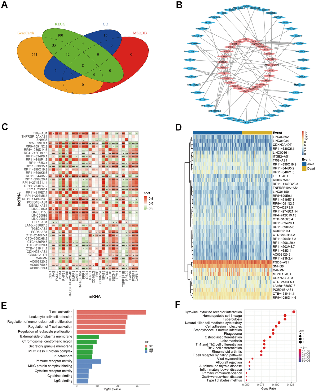 Co-expression network of genes serves as a valuable approach for functional gene annotation and identification of unknown functional genes by linking them with biological processes. Hence, constructing necroptosis-related mRNA-lncRNA co-expression network can facilitate the identification of NRlncRNAs. At first, we searched in the GeneCards, MSigDB, KEGG and GO databases to obtain 721 necroptosis-related mRNAs (Figure 2A). Then, 64 mRNA-lncRNA co-expression pairs were obtained after 721 necroptosis-related mRNAs were interacted with all the lncRNAs of TCGA-SARC data (Figure 2B, 2C). LncRNAs in the co-expression network were highly correlated with necroptosis-related mRNAs, namely, 42 NRlncRNAs were screened by mRNA-lncRNA co-expression network. The heatmap of NRlncRNA expression also showed the differential trend in lncRNA expression (Figure 2D). We conducted GO and KEGG enrichment analysis by extracting 27 necroptosis-related mRNAs from the co-expression network, aiming to further expose the biological differences and describe the biological roles of NRlncRNAs in sarcomas (Figure 2E, 2F and Supplementary Table 3). The 5 most important terms from the GO and KEGG enrichment analysis were all associated with immune processes, indicating that sarcomas NRlncRNAs may have biological functions related to immune regulation.