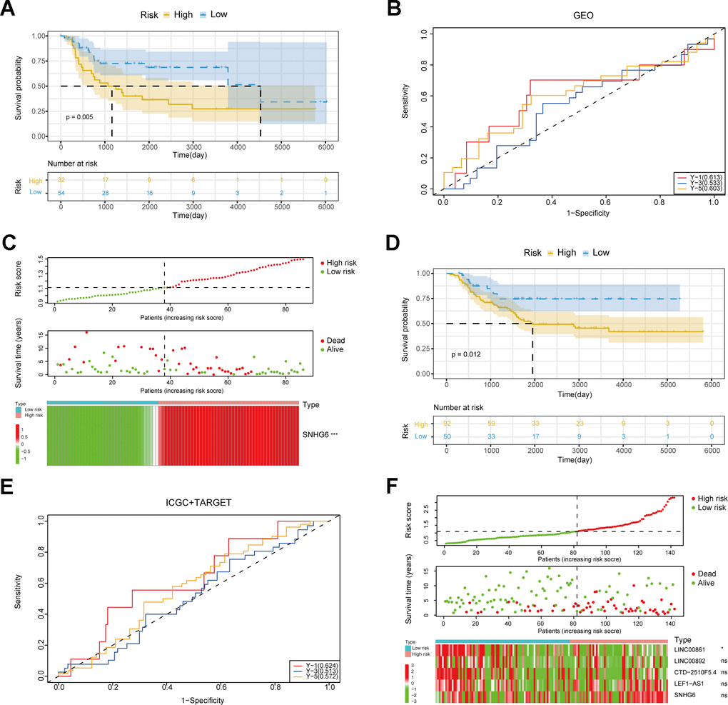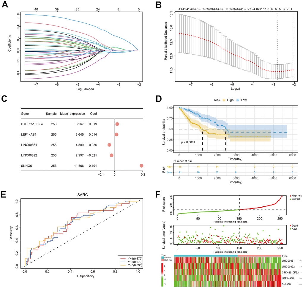 TCGA-SARC clinical characteristics were analyzed by LASSO-COX to identify prognosis-related risk genes. The best lambda value was selected, and only the genes whose coefficients are not zero were retained as prognosis-related lncRNAs after regression. The risk model was constructed by selecting risk coefficients corresponding to prognosis-related lncRNAs. Then, the risk scores of patients were calculated, and the R package “survival” was utilized to assess the ideal grouping threshold of the risk scores of patients. The KM survival analysis was conducted on patients in high- and low-risk groups using the R package “survminer”, which enabled the calculation of prognosis time the difference between the two groups. The risk model’s efficiency was assessed by utilizing the R package “timeROC”. R package “ggplot2” and “pheatmap” were utilized to draw the triple plot of prognostic risk based on clinical information of patients. Subsequently, based on the grouping threshold of the training set, we grouped two external independent datasets to verify the accuracy of the risk model.