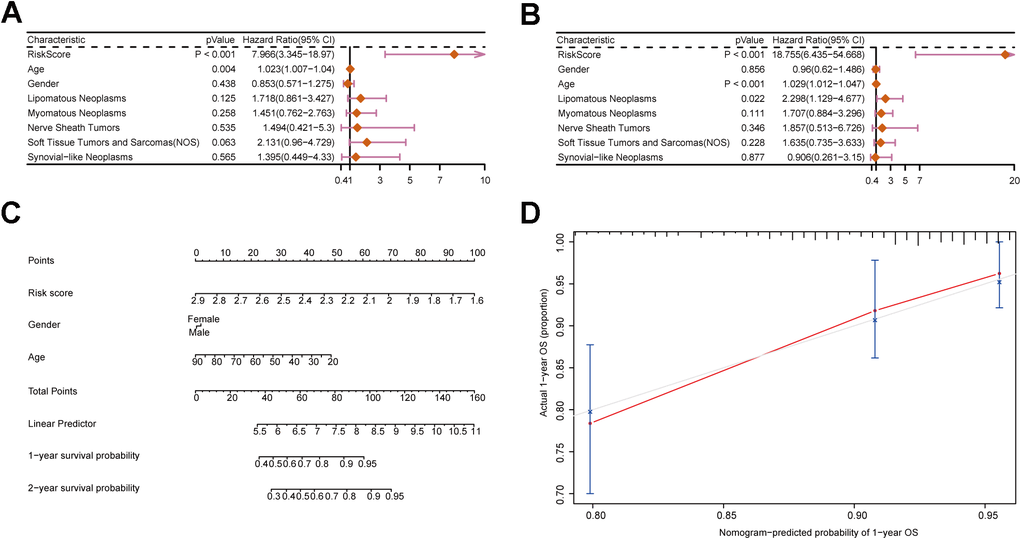 To assess the influence of clinical characteristics on the prognosis of sarcoma patients and establish whether the risk score acts as an independent risk factor, we conducted univariate and multivariate Cox regression analyses on various clinical characteristics and risk score (Supplementary Table 4). The forest plot demonstrated the risk score as independence risk factor for patients’ prognosis (Figure 5A, 5B). Next, we utilized a nomogram to visualize the influence of each clinical characteristics on the outcome variable. The outcome revealed that the risk model had the greatest predictive capacity for both 1- and 2-year survival (Figure 5C). The nomogram result was further supported by the calibration curve (Figure 5D). To sum up, our prognostic model’s score is an excellent predictor of sarcoma patients’ prognosis, and it is independent of multiple clinical characteristics.