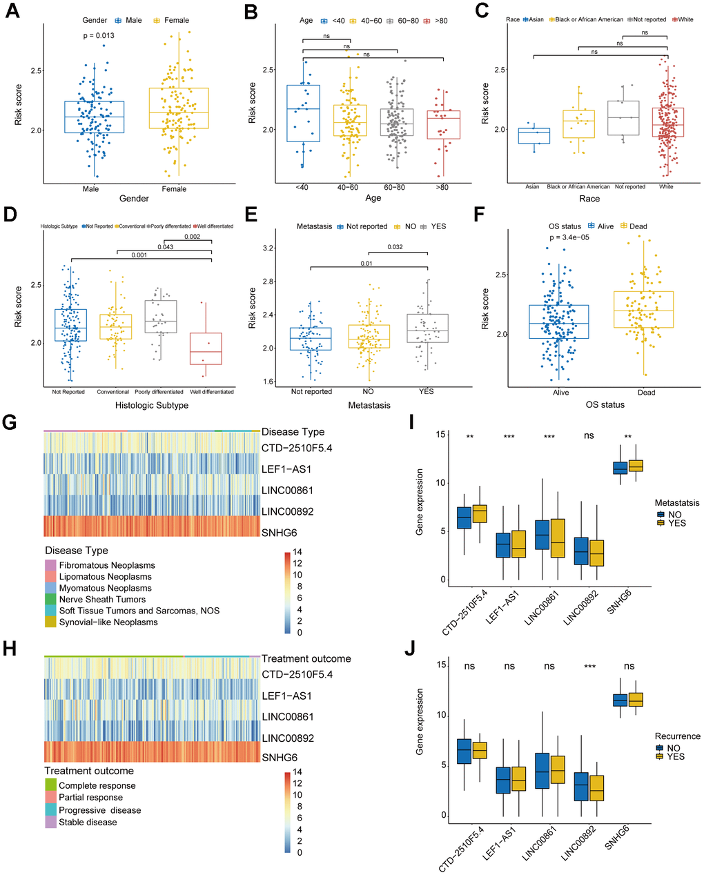 In order to investigate clinical characteristics in risk model, we selected clinical information of patients, including gender, age, race, histologic subtype, metastatic status, OS status, disease type, recurrence, and treatment outcome, to draw baseline data chart (Supplementary Table 5). The result showed that the gender group revealed significant difference between males and females (Figure 6A). In the age group, it was evident that the risk score of patients below 40 years old was considerably greater compared to the other groups, yet the difference in risk score did not show statistical significance (Figure 6B). Figure 6C shows that there were no significant differences in the race group, suggesting that the clinical prognosis of sarcomas may not be influenced by race. In histologic subtype, significant differences were shown in risk score of well differentiated sarcomas and conventional and poorly differentiated sarcomas (Figure 6D). Moreover, significant differences existed between the groups with metastasis and without metastasis, and the metastatic group exhibited a higher risk score, indicating that the risk model has the capability to forecast sarcoma metastasis (Figure 6E). Significant difference in risk score was also observed among the OS status group (Figure 6F). To further explore the specificity of risk genes among different clinical characteristics, we analyzed 4 clinical characteristics: disease type, treatment outcome, metastatic status and recurrence. The visualized heatmaps showed that SNHG6 had the highest expression level among 5 risk genes of sarcoma patients with any disease types and treatment outcomes, whereas LNC00892 exhibited the lowest expression level (Figure 6G, 6H). In the metastatic group, SNHG6 and CTD-2510F5.4 exhibited elevated expression levels compared to the non-metastatic group, whereas LEF1-AS1, LINC00861, and LINC00892 showed the opposite trend (Figure 6I). LINC00892 of recurrent patients showed a trend of low expression compared to non-recurrent patients (Figure 6J). All of these results reveal that the risk genes show different expression trends in sarcoma patients with different clinical characteristics and prognostic outcomes, which demonstrates the validity of screened risk genes.
