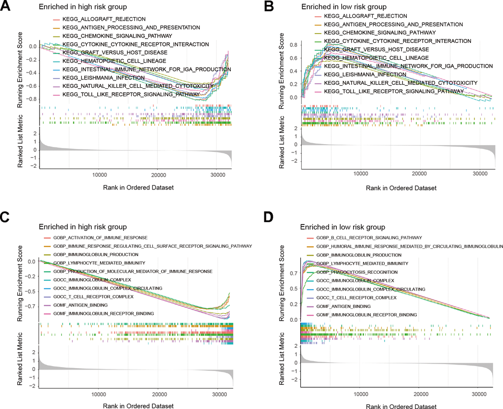 The R package “org.Hs.eg.db” and “clusterprofiler” were employed to perform GO functional annotation and KEGG pathway enrichment for the mRNA that showed significant association with the NRlncRNAs in the co-expression network. Then, GSEA was conducted in the risk model of NRlncRNAs.