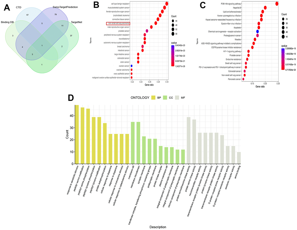 213 drug target genes were identified from four drug target databases, including CTD, SwissTargetPrediction, Binding DB, and TargetNet, and their intersection was shown in Figure 1A. The results of DO analysis indicated that these drug genes mainly functioned in various cancers, such as non-small cell lung cancer, connective tissue cancer, and musculoskeletal system cancer (Figure 1B). KEGG analysis revealed that these genes were enriched in tumor pathways closely related to tumor pathways, including EGFR tyrosine kinase inhibitor resistance, PI3K-Akt signaling pathway, PD-L1 expression, and PD-1 checkpoint pathway (Figure 1C). Furthermore, GO analysis showed that drug genes were mainly enriched in biological processes of peptide-serine/threonine modification (BP), protein kinase complex in cellular components (CC), and protein serine/threonine kinase activity in molecular function (MF) (Figure 1D).