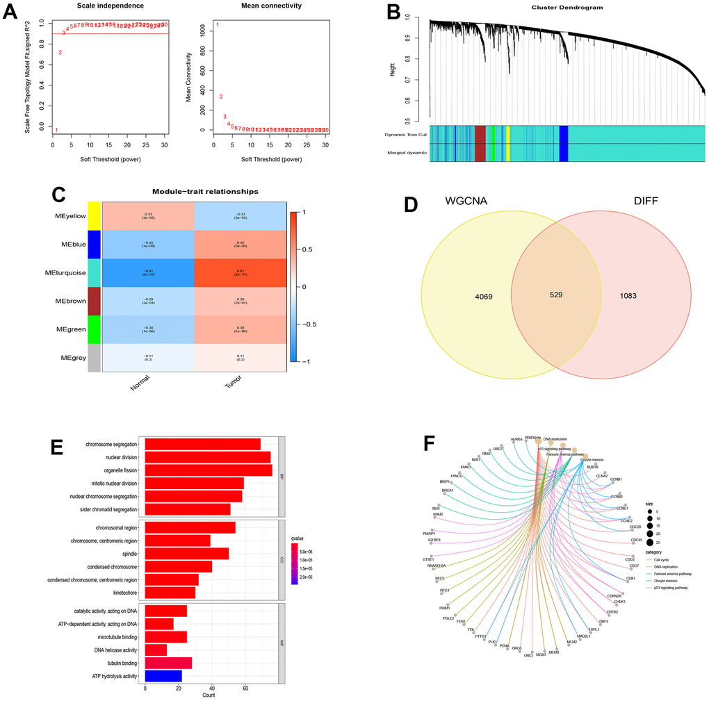 From the NSCLC data set (GSE19188), we screened out 1612 differentially expressed genes compared with normal tissues. Then, we selected a correlation coefficient of 0.86 corresponding to a soft threshold of 3 to construct a scale-free network for WGCNA analysis (Figure 2A, 2B). Through WGCNA analysis, all genes of NSCLC were constructed into 6 different gene modules, namely MEyellow, MEblue, MEturquoise, MEbrown, MEgreen and MEgrey, as shown in Figure 2C. According to the correlation analysis between the gene modules and Tumor shown in Figure 2C, These gene modules are related to the occurrence and development of NSCLC, among which MEturquoise has the most significant correlation with NSCLC and is considered as a key gene module. Based on the intersection of genes in this module and differentially expressed genes, 529 disease-causing genes were found. These pathogenic genes were mainly enriched in organelle fission (BP), chromosomal region (CC) and catalytic activity acting on DNA (MF) in functional enrichment analysis. At the same time, KEGG analysis showed that these pathogenic genes were closely related to cell cycle, DNA replication and P53 signaling pathway (Figure 2D–2F).