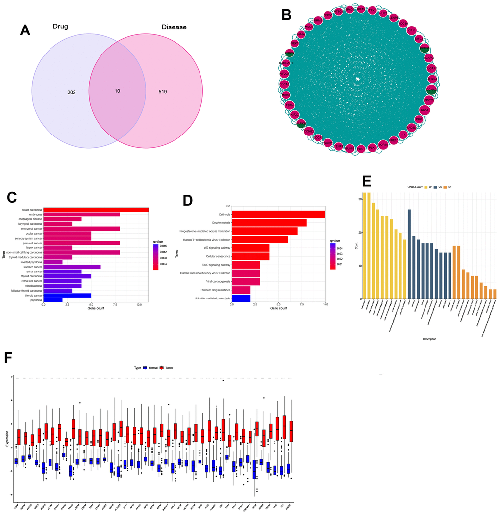 From Comparative Toxicogenomics Database (CTD) (http://ctdbase.org/) [16], SwissTargetPrediction (http://www.swisstargetprediction.ch/) [17], BindingDB (http://bindingdb.org/bind/) [18], TargetNet (http://targetnet.scbdd.com/home/index/) [19] four databases downloaded the target information of tetrandrine. In order to standardize and harmonize information obtained from various databases, we have retained the drug gene names from these database results while eliminating extraneous expression data. We then used a Venn diagram to display the combined results of drug genes in the above database. Disease Ontology (DO)/Gene Ontology (GO)/Kyoto Encyclopedia of Genes and Genomes (KEGG) analyzes were performed using these pharmacogenes, respectively.