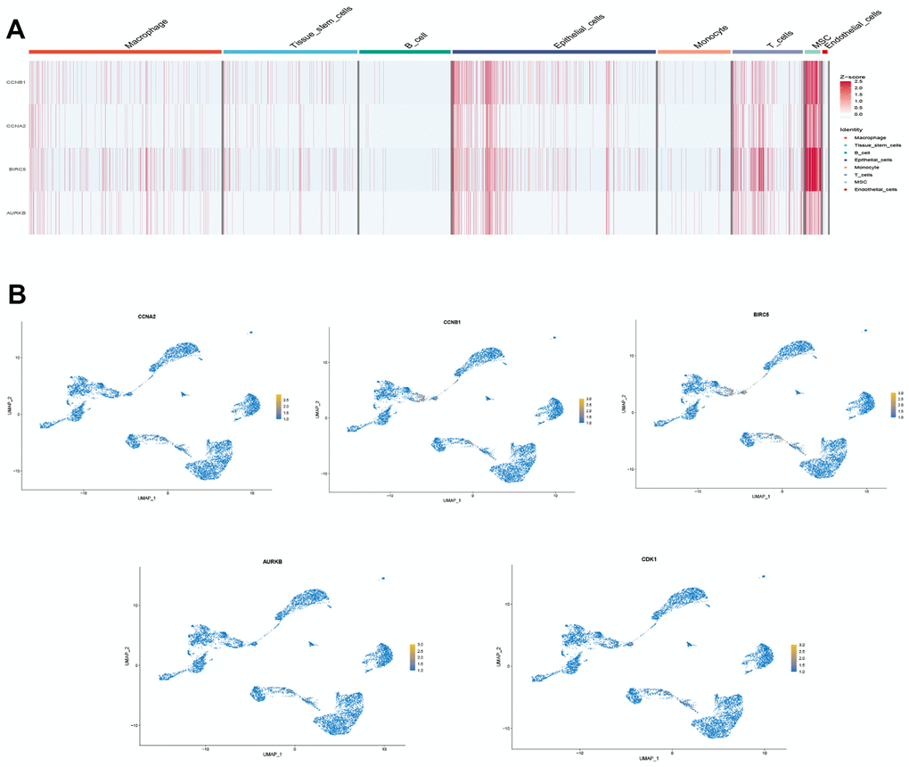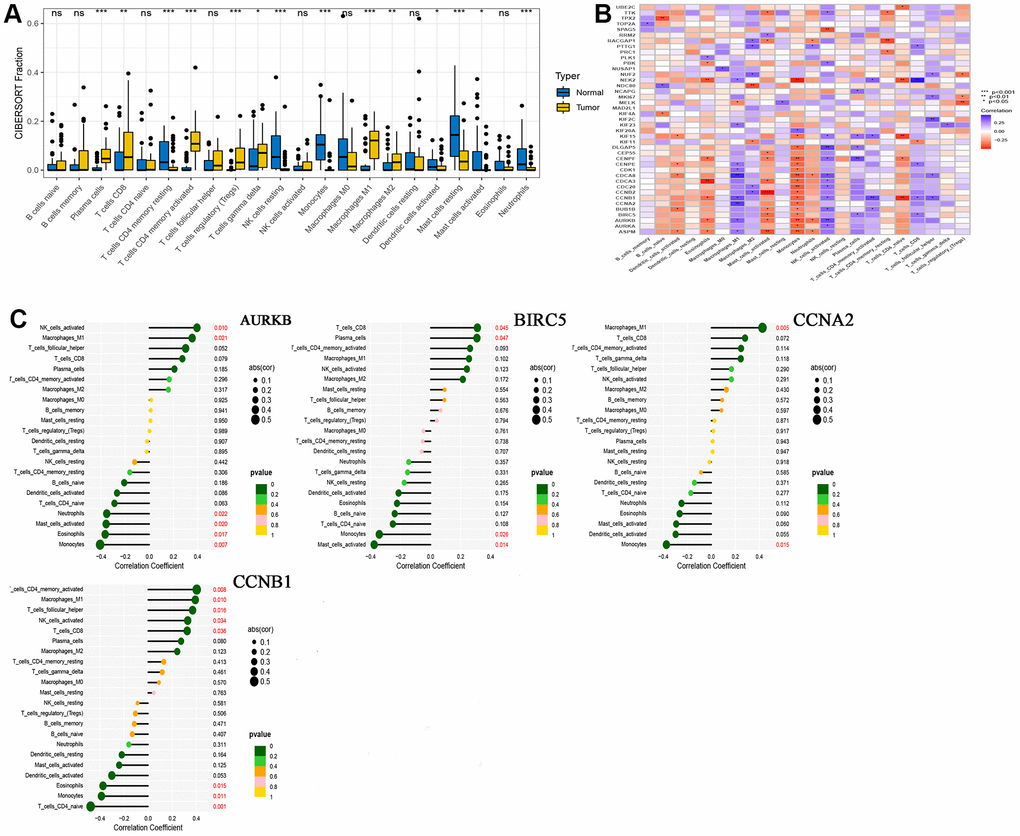 We performed immune infiltration analysis for normal and tumor groups using CIBERSORT algorithms, and the results are shown in Figure 4A. These calculation results allow us to intuitively understand that there are significantly more Plasma cells, various types of T cells, Macrophages M1 and Macrophages M2 in tumor tissues. The results of correlation analysis between 41 hub genes and immune cells are shown in Figure 4B. At the same time, we found that four drug-disease genes (CCNB1, CCNA2, BIRC5 and AURKB) were negatively correlated with monocytes, and had statistical significance, but showed different correlations with other types of immune cells (Figure 4C).