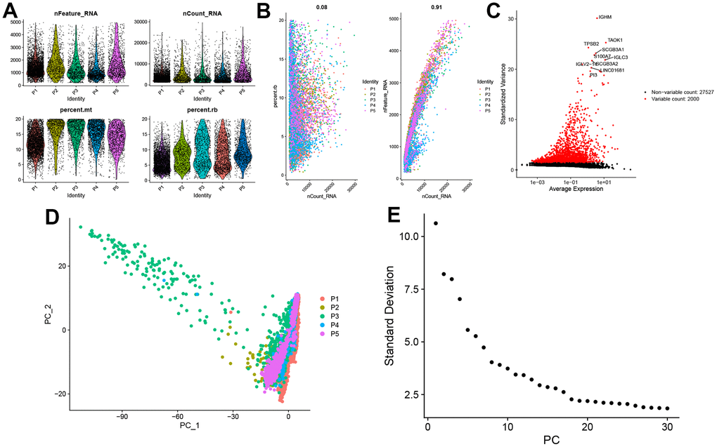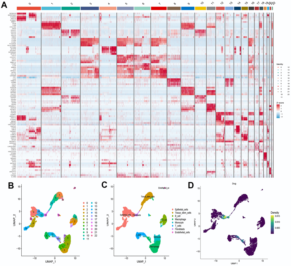 We selected the first five samples of the single-cell dataset (GSE148071), and visualized the QC metrics as a violin after following the quality control (QC) criteria of expressing more than 200 genes and less than 10,000 genes per cell, and mitochondrial content <20% (Figure 5A), while finding a positive correlation with total intracellular sequences (R = 0.91, Figure 5B), we also found a slight correlation between sequencing depth and rRNA (R = 0.08). A total of 2,000 highly variable features were identified from 27,527 features (Figure 5C). When performing PCA dimensionality reduction screening, we selected 2000 highly variable features as input, and finally selected 20 PCs with significant differences for further analysis (Figure 5D, 5E). Using the UMAP algorithm, we clustered the cells into 23 clusters and identified 15058 marker genes. In the heatmap, the top 10% of marker genes in each cluster are represented (Figure 6A). 23 clusters were annotated according to marker genes: cluster 2/10 is B cells, cluster 21 is Endothelial cells, cluster 0/4/12/14/15/20 is Epithelial cells, cluster 18 is Fibroblasts, cluster 3/5/7/16/22 is Macrophage, cluster 6/17/19 is Monocyte, cluster 8/13 is T cells, cluster 1/9/11 is Tissue stem cells (Figure 6B, 6C). The up-regulated differentially expressed genes were retained by the FindAllMarkers function and combined with the four drug-disease genes in the hub genes to analyze the distribution of these genes in cell subtypes (Figure 6D). According to the data in Figure 7A, 7B, it can be known that these four genes are highly expressed in epithelial cells, macrophages, T cells and fibroblasts.