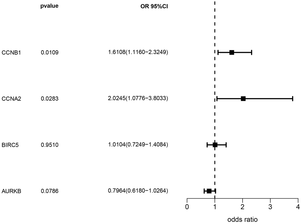 This study is based on publicly available summary-level data from genome-wide association studies (GWAS) and expression quantitative trait loci (eQTL) studies. These studies have been approved by relevant institutional review boards and informed consent has been obtained from the participants. Four hub genes (CCNB1, CCNA2, BIRC5, and AURKB) were selected as exposures, and their available eQTLs were used as genetic instruments for each gene. The eQTL summary-level data were sourced from eQTLGen (https://www.eqtlgen.org/) [23]. We identified common eQTLs (minor allele frequency [MAF] >1%, P < 5.0 × 10-8) significantly associated with the expression of the four genes in blood samples. The summary-level data for non-small cell lung cancer (NSCLC) GWAS were obtained from FINNGEN (https://www.finngen.fi/en) [24] R8, with a total of 263,448 samples, including 3,865 NSCLC cases and 259,583 controls. Subsequently, SMR software version 1.31 (https://yanglab.westlake.edu.cn/software/smr/#Download) [25] was used for allele harmonization and analysis. We utilized the F-statistic to assess weak instrument variable effects and included SNPs with F > 10 to minimize weak instrument bias. For the SMR method, a P-value ≥0.01 from the heterogeneity in dependent instruments (HEIDI) test indicates no heterogeneity [26]. This step was performed to ensure the reliability and stability of the results.