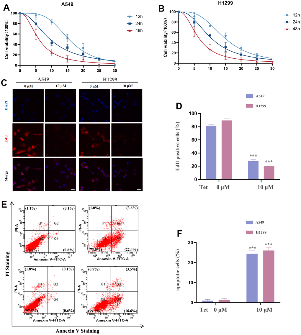 The NSCLC cell lines A549 and H1299 were maintained in 1640 medium (Hyclone, USA) containing 10% FBS (Gibco, USA) at 37° C in an atmosphere of 5% CO2. These cells were digested with pancreatin (Life-iLab, Shanghai, China). NSCLC cells were primarily seeded in several 96-well plates, and after tetrandrine treatment, CCK-8 reagent was added and operated according to the manufacturer’s instructions. Cell apoptosis was conducted by Flow cytometry using Annexin V– FITC Detection Kit (Solarbio, Beijing, China). EdU incorporation assay was employed to conduct the cell proliferation capacity of NSCLC cells treated with tetrandrine (Abbkine, China) according to the manufacturer’s instructions. Finally, images were obtained and preserved under the confocal microscope.