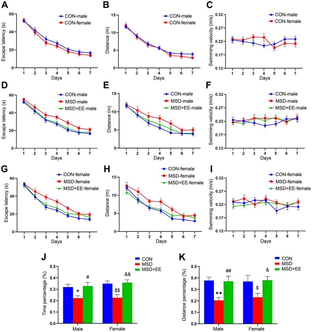 In the acquisition phase of the MWM test, the results showed no sex differences in escape latency and swim distance for the control and other treatment groups (Figure 1A, 1B and Supplementary Figures 1A, 1B, 2A, 2B). However, marked differences in latency and swim distance were observed between treatments in all three groups (latency: male: F(2, 21) = 11.46, P < 0.01; female: F(2, 21) = 13.68, P < 0.01; distance: male: F(2, 21) = 10.18; female: F(2, 21) = 18.94, P < 0.01; Figure 1D, 1E, 1G, 1H). Post hoc comparisons showed that the escape latency and swim distance were increased in the MSD group when compared with the Control group (Ps < 0.05). However, the escape latency and swim distance were shorter in the MSD+EE group than in the MSD group (Ps < 0.05). No difference in swimming velocity among the groups whether controlling for sex or treatment (Figure 1C, 1F, 1I and Supplementary Figures 1C, 2C).