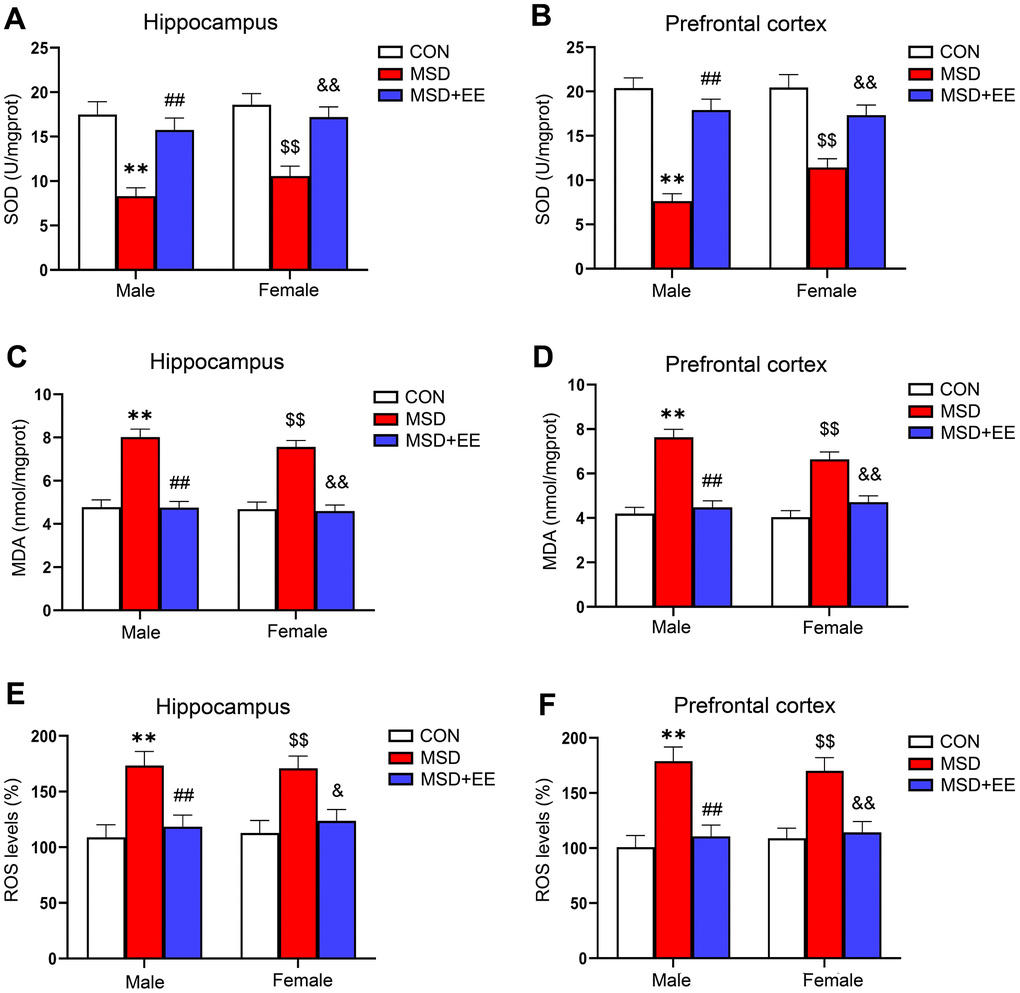In the hippocampus and prefrontal cortex, the levels of SOD, MDA, and ROS were obviously different in all groups (hippocampus: SOD: F(2, 42) = 28.73, P < 0.01; MDA: F(2, 42) = 63.83, P < 0.01; ROS: F(2, 30) = 17.16, P < 0.01; prefrontal cortex: SOD: F(2, 42) = 48.86, P < 0.01; MDA: F(2, 42) = 55.12, P < 0.01; ROS: F(2, 30) = 24.45, P < 0.01; Figure 2A–2F). Compared with the control group, MDA and ROS levels in both brain regions were significantly increased in the MSD group, whereas SOD levels were decreased (Ps < 0.05). However, MDA and ROS levels were lower in the MSD+EE group than in the MSD group in both brain regions, whereas the opposite was observed for SOD content (Ps < 0.05).