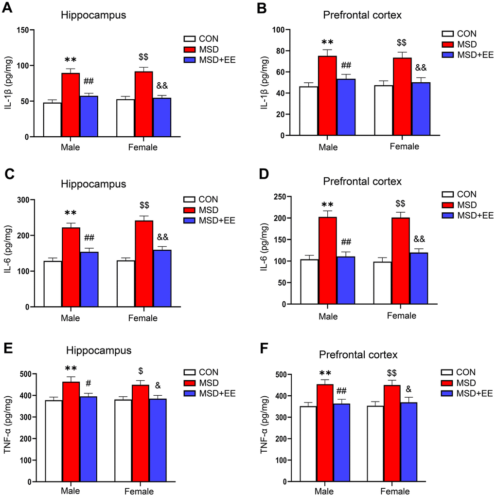 In the hippocampus and prefrontal cortex, the IL-1β, IL-6, and TNF-α levels differed among the groups (hippocampus: IL-1β: F(2, 42) = 48.44, P < 0.01; IL-6: F(2, 42) = 57.38, P < 0.01; TNF-α: F(2, 42) = 12.52, P < 0.01; prefrontal cortex: IL-1β: F(2, 42) = 20.42, P < 0.01; IL-6: F(2, 42) = 51.13, P < 0.01; TNF-α: F(2, 42) = 13.67, P < 0.01; Figure 3A–3F). Additionally, the IL-1β, IL-6, and TNF-α levels were increased in the MSD group relative to Control group (Ps < 0.05). Nevertheless, EE significantly mitigated these increases (Ps < 0.05).