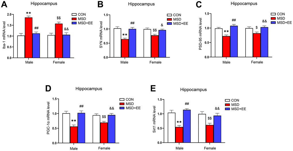 There were remarkable differences in hippocampal ionized calcium-binding adapter molecule 1 (Iba-1), synaptophysin (SYN), postsynaptic density protein-95 (PSD-95), PGC-1α, and Sirt1 mRNA levels between the three groups (Iba-1: F(2, 42) = 44.09, P < 0.01; SYN: F(2, 42) = 29.66, P < 0.01; PSD-95: F(2, 42) = 23.27, P < 0.01; PGC-1α: F(2, 42) = 26.91, P < 0.01; Sirt1: F(2, 42) = 29.17, P < 0.01; Figure 4A–4E). Compared with the Control group, the hippocampal mRNA levels of SYN, PSD-95, PGC-1α, and Sirt1 were significantly decreased, whereas that of Iba-1 was increased (Ps < 0.05). Furthermore, the mRNA levels of SYN, PSD-95, PGC-1α, and Sirt1 were higher and that of Iba-1 was lower in the MSD+EE group compared to the MSD group (Ps < 0.05).