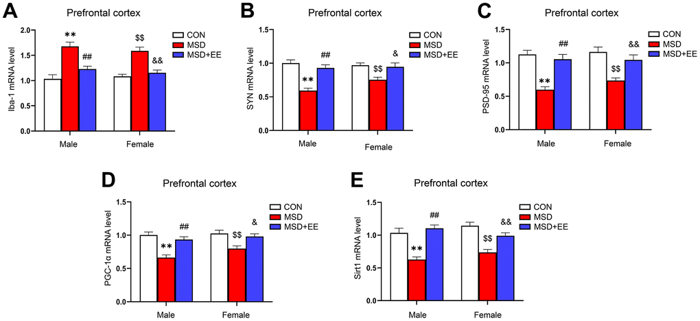 The mRNA levels of Iba-1, SYN, PSD-95, PGC-1α, and Sirt1 in the prefrontal cortex differed significantly in all groups (Iba-1: F(2, 42) = 39.98, P < 0.01; SYN: F(2, 42) = 28.68, P < 0.01; PSD-95: F(2, 42) = 31.89, P < 0.01; PGC-1α: F(2, 42) = 24.17; P < 0.01; Sirt1: F(2, 42) = 37.12, P < 0.01; Figure 5A–5E). The Tukey test indicated that, compared with the controls, the mRNA levels of SYN, PSD-95, PGC-1α, and Sirt1 in the prefrontal cortex were significantly decreased, whereas that of Iba-1 was increased in mice of the MSD group (Ps < 0.05). Furthermore, the prefrontal cortical levels of SYN, PSD-95, PGC-1α, and Sirt1 were higher, and that of Iba-1 was lower in the MSD+EE group relative to MSD group (Ps < 0.05).