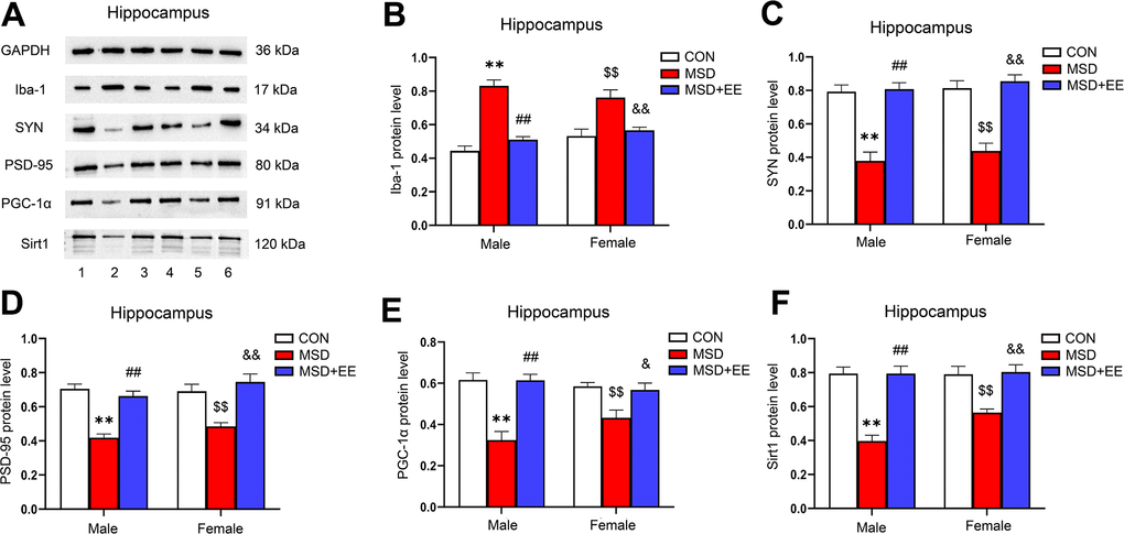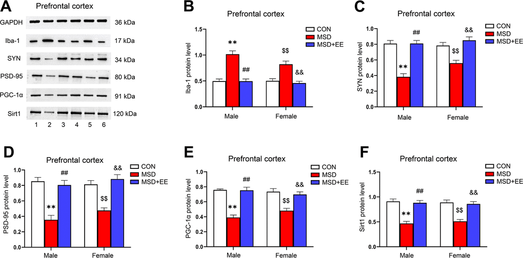 The expression levels of Iba-1, SYN, PSD-95, PGC-1α, and Sirt1 in the prefrontal cortex were different in all groups (Iba-1: F(2, 30) = 52.42, P < 0.01; SYN: F(2, 30) = 50.46, P < 0.01; PSD-95: F(2, 30) = 44.23, P < 0.01; PGC-1α: F(2, 30) = 52.62, P < 0.01; Sirt1: F(2, 30) = 48.86, P < 0.01; Figure 7A–7F). Comparison results show that the protein levels of SYN, PSD-95, PGC-1α, and Sirt1 in the prefrontal cortex were significantly decreased in the MSD group compared with the Control group, whereas that of Iba-1 was increased (Ps < 0.05). However, long-term EE reversed these MSD-mediated changes in the levels of the above proteins (Ps < 0.05).