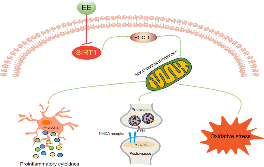 We found that long-term EE ameliorated late-pregnancy SD-induced cognitive impairment, attenuated neuroinflammation and oxidative stress, and upregulated synaptic protein levels in aged offspring mice. These effectively beneficial effects were associated with the attenuation of mitochondrial biogenesis dysfunction via the activation of the Sirt1/PGC-1α pathway (Figure 8). These findings suggest that long-term EE may be an effective non-pharmacological intervention for early-life stress-induced cognitive dysfunction, and the Sirt1/PGC-1α signaling pathway may be a promising therapeutic target for this condition.