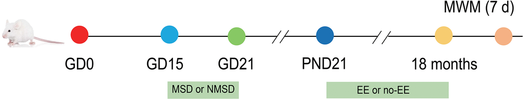 2-month-old CD-1 mice were obtained from Beijing Vital River Laboratory Animal Technology Co., Ltd (Beijing, China). After two weeks of environmental adaptation, the mice were mated at a male: female ratio of 1:2. Pregnant female mice were randomized into a control group and a SD group. Female mice in the SD group were subjected to SD during late pregnancy, whereas no treatment was administered to animals in the control group. At 21 days of age, the male and female offspring were divided into the following three groups respectively: control group, MSD group, and MSD+EE group. Mice in the MSD+EE group were given an enriched environment from 21 days to 18 months after birth. During the experiments, all animals had access to water and food ad libitum and were reared at a temperature of 22-25° C and a humidity of 50 ± 5%. In addition, a 12-hour/12-hour light/dark cycle was provided with lights on at 8:00 am (Figure 9).