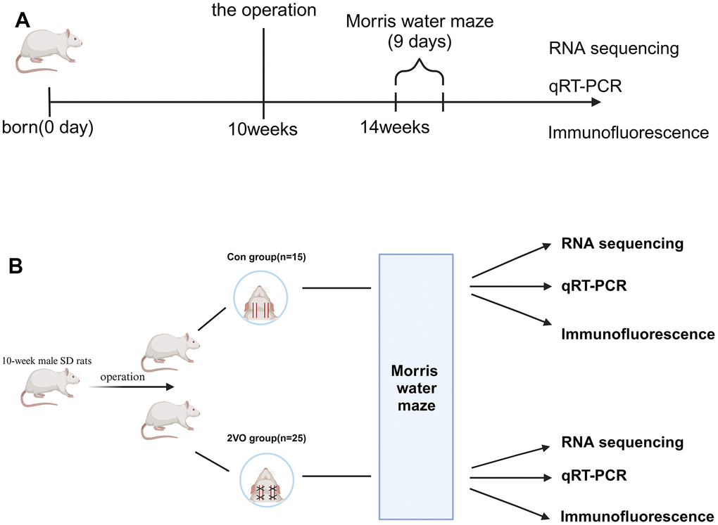 40 10-week male SD rats were purchased from Hunan SJA Laboratory Animal Co., Ltd. The rats were housed in the SPF condition and accessed food and water ad libitum, with the 12-h light/dark cycle light on from 7:00 a.m. to 7:00 p.m. The rats were divided into two groups: the sham group (Con group, n=15), and the bilateral common carotid arteries occlusion group (2VO group, n=25) (Figure 1).