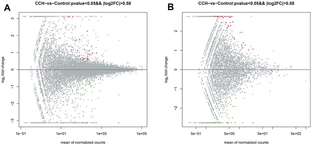 The top 5 upregulated mRNAs were LOC100912642, LOC108348080, C4a, Katnal1, and LOC103689941, respectively with fold changes of 44.59, 34.01, 8.54, 8.07, and 5.77, compared to the control group. The top 5 downregulated mRNAs were Tph1, LOC100912599, LOC100910575, Lilrb3l, and LOC103689983, respectively with fold changes of 0.00073, 0.031, 0.031, 0.042, and 0.048, compared to the Con group. The top 5 upregulated circRNAs were circRNA_09183|Chr7:112745541_112761127_-, circRNA_04107|Chr17:81990547_82003698_+, circRNA_09363|Chr8:508994 519112 +, circRNA_05625|Chr2:257936685 257945564_+, circRNA_06465|Chr3:129077671_129078456_-, respectively with fold change of 9.01, 8.48, 8.39, 7.87, and 6.98, compared to control group. The top 5 downregulated circRNAs were Tph1, LOC100912599, LOC100910575, Lilrb3l, and LOC103689983, respectively with fold changes of 0.10, 0.17, 0.17, 0.19, and 0.26 compared to the control group. The MA plot was constructed to visualize the dramatically different expression levels of circRNA and mRNAs in the CCH and the Con groups (Figure 10A, 10B).