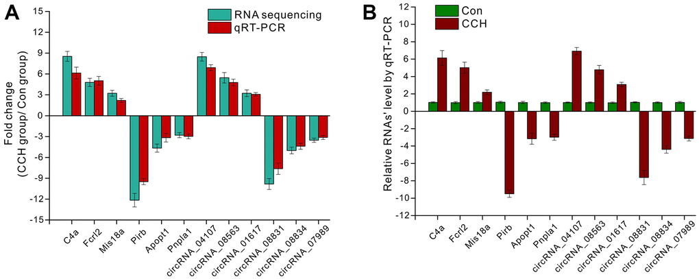 To validate the RNA sequencing data, qRT-PCR was employed to compare the consistency between the RNA sequencing and qRT-PCR. 3 upregulated mRNAs (C4a, Fcrl2, Mis18a) and circRNAs (circRNA_04107, circRNA_08563, circRNA_01617) and downregulated mRNAs (Pirb, Apopt1, Pnpla1) and circRNAs (circRNA_08831, circRNA_08834, circRNA_07989) were selected to be verified. The data showed that there were similar trends for gene expressions between sequencing and qRT-PCR (Figure 11A). For the selected upregulated mRNAs and circRNAs in CCH groups, the qRT-PCR data showed that these genes increased compared to the Con groups. Similarly, qRT-PCR data showed that these downregulated genes decreased compared to the Con groups (Figure 11B). These suggested that RNA sequencing had enough validation for further analysis.