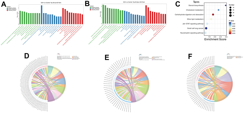 To analyze the probable mechanisms underlying the altered neuropathology and cognitive function, the RNA sequencing data were enriched on different GO terms and KEGG pathways. The GO enrichment showed that the top 5 upregulated enrichment terms in the biological process were positive regulation of I-kappaB kinase/NF-kappaB signaling, adherens junctions assembly, positive regulation of cell migration involved in sprouting angiogenesis, camera-type eye morphogenesis, corpus callosum development. The top 5 upregulated enrichment terms in cellular components were cyclin-dependent kinases/CDK, positive transcription elongation factor complex, NURF complex, ciliary transition fiber, endoplasmic reticulum membrane, and Rb-E2F complex. The top 5 upregulated enrichment terms in molecular function were beta-tubulin binding, caspase binding, dynein heavy chain binding, LIM domain binding, and androgen receptor binding (Figure 12A). The GO enrichment showed that the top 5 downregulated enrichment terms in the biological process were striatal medium spiny neuron differentiation, maintenance of postsynaptic density structure, positive regulation of long-term neuronal synaptic plasticity, chemotaxis, cell migration. The top 5 downregulated enrichment terms in cellular components were Barr body, protein-DNA complex, exocytic vesicle, and actin cytoskeleton aggresome. The top 5 downregulated enrichment terms in molecular function were structural constituent of the postsynaptic density, protein phosphatase 1 binding, dynein intermediate chain binding, phospholipid binding, and lipid binding (Figure 12B). The top 5 enrichment KEGG pathways were Steroid biosynthesis, Cholesterol metabolism, Carbohydrate digestion and absorption, Ether lipid metabolism, Jak-STAT signaling pathway (Figure 12C). The corresponding relationship between enrichment terms and related DE circRNAs was demonstrated in the chord diagram (Figure 12D, 12E, 12F). In these enriched GO terms and KEGG pathways, the immunology, inflammation, and metabolisms change-related aspects were the main enrichment subjects. These suggested that the immunology, inflammation, and metabolism dysfunction signaling pathway took part in cognitive dysfunction after CCH and circRNAs might participate in regulating the expression of DE mRNAs.
