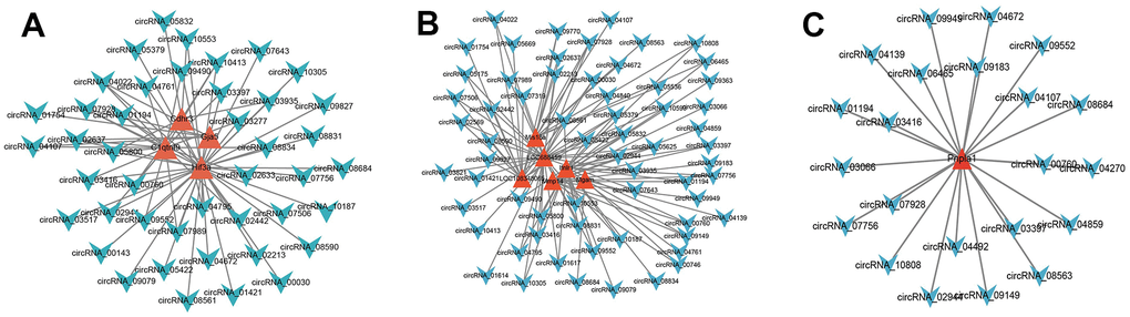 Through Pearson correlation analysis between circRNA and mRNA expressions, the paired circRNA and mRNA met the threshold were used to construct the co-expression network. The representative co-expression net was demonstrated (Figure 13A, 13B). The same one gene was co-expressed with many circRNAs. These suggested that DE mRNAs may be regulated by many circRNAs.