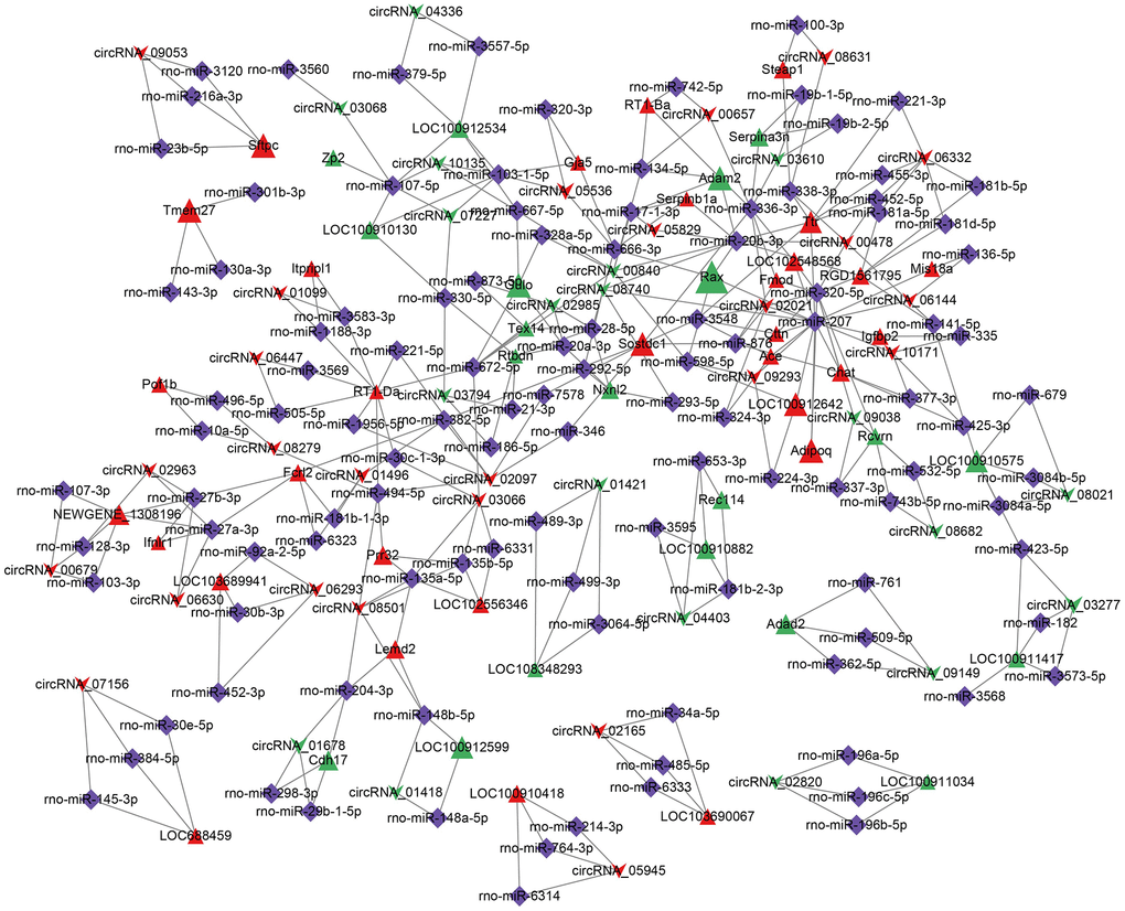 Through prediction analysis, the 44665 miRNA-mRNA pairs and 4675 miRNA-circRNA pairs were predicted. The common miRNAs in two pair kinds were the nodes to construct the ceRNA network based on the MuTATE score. The top 48 MuTATE score pairs were used to plot a ternary network diagram (Figure 14). The network plot showed that the DG mRNAs were regulated by different circRNAs through miRNAs.