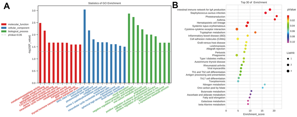 Gene Ontology (GO) annotated the gene function in different terms. GO analysis displayed the annotated DE gene function in three levels: molecular function, biological process, and cellular component through a hypergeometric distribution test. Kyoto Encyclopedia of Genes and Genomes (KEGG) annotated the gene function in different pathways. KEGG analysis displayed the annotated DE gene function through a hypergeometric distribution test. For the hypergeometric distribution test, a P-value was obtained to determine the degree of the function and pathway enrichment of the DE genes. P-value < 0.05 was considered statistically significant [23].