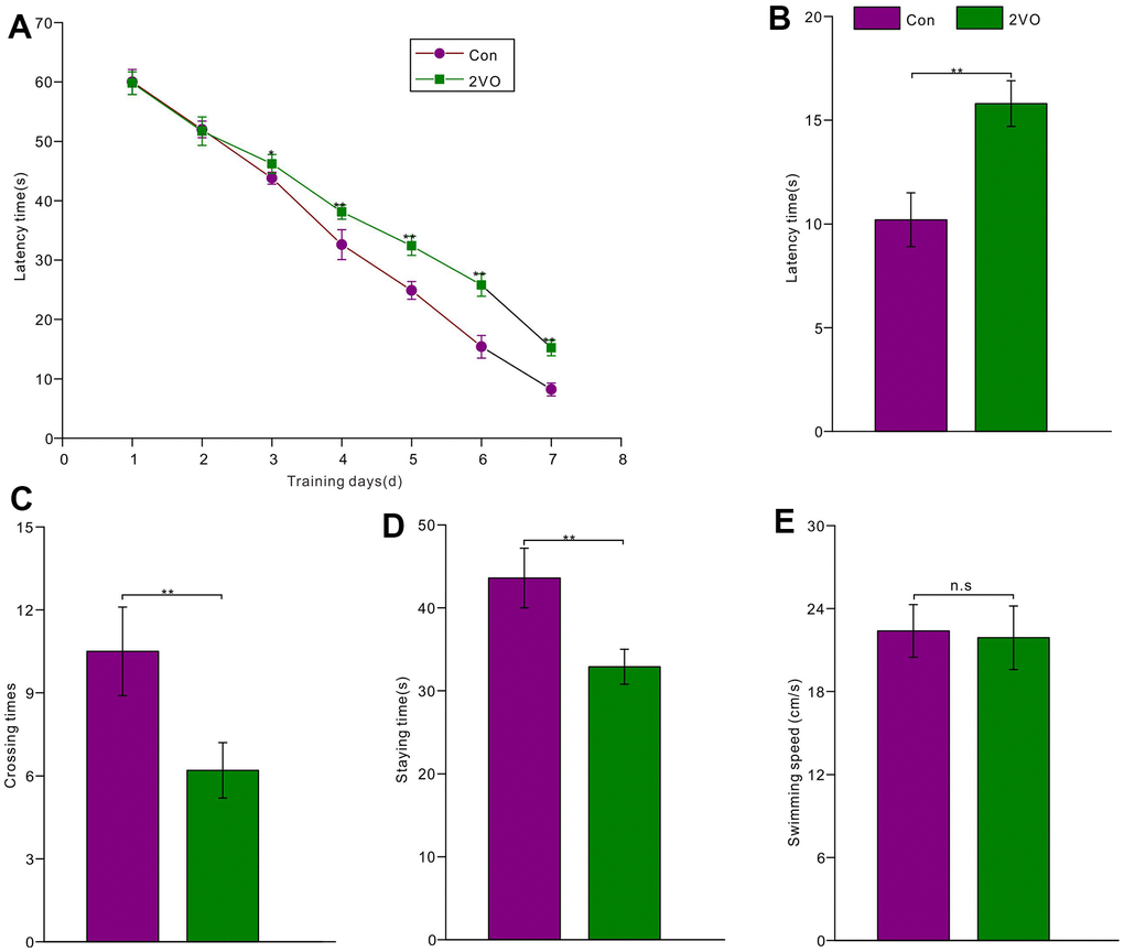 To investigate the effect of CCH on cognition, the Morris water maze was employed to test spatial learning and memory abilities among the two groups. The 7-day learning training trials showed that rats of the 2VO group had a longer latency time to reach the platform than those of the Con group (from 3rd day to 7th day P<0.05) (Figure 2A). After 1-day rest and removing the platform, the short-term memory was tested. The test data showed that the 2VO group had a longer latency time to reach the platform than the Con group (P<0.01) (Figure 2B). Meanwhile, the 2VO group had less crossing times to shuttle the platform area than the Con group (P<0.01) (Figure 2C). And the 2VO group had the less staying time in platform quadrant than these of the Con group (P<0.01) (Figure 2D). Nevertheless, there was no difference in swimming speed between the 2VO group and the Con group (P>0.05) (Figure 2E).