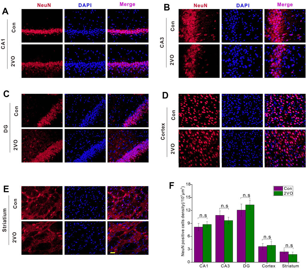 To explore the mechanisms of cognitive dysfunction after CCH, the neuron density was examined by NeuN-staining. The NeuN-staining showed that there was no dramatic difference in the density of NeuN-positive neurons in CA1 (Figure 3A), CA3 (Figure 3B), DG (Figure 3C), cortex (Figure 3D), and striatum (Figure 3E) between the 2VO and Con group (P>0.05) (Figure 3F).