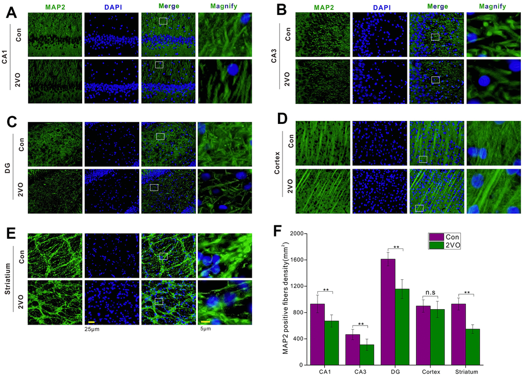 The nerve fibers were the important neuronal cables to connect the neurons in different regions and form the specific circuit, thereby certain brain functions could be played out. To figure out whether CCH could impact the nerve fiber, the brain slice was developed with MAP2 antibody. The MAP2 staining showed that CCH could reduce the density of MAP2-positive fiber in CA1 (Figure 4A), CA3 (Figure 4B), DG (Figure 4C), and striatum (Figure 4E), compared to the Con group (P<0.01) (Figure 4F). But there was no noticeable difference for MAP2-positive fiber between the 2VO group and the Con group (P>0.05) (Figure 4D, 4F).