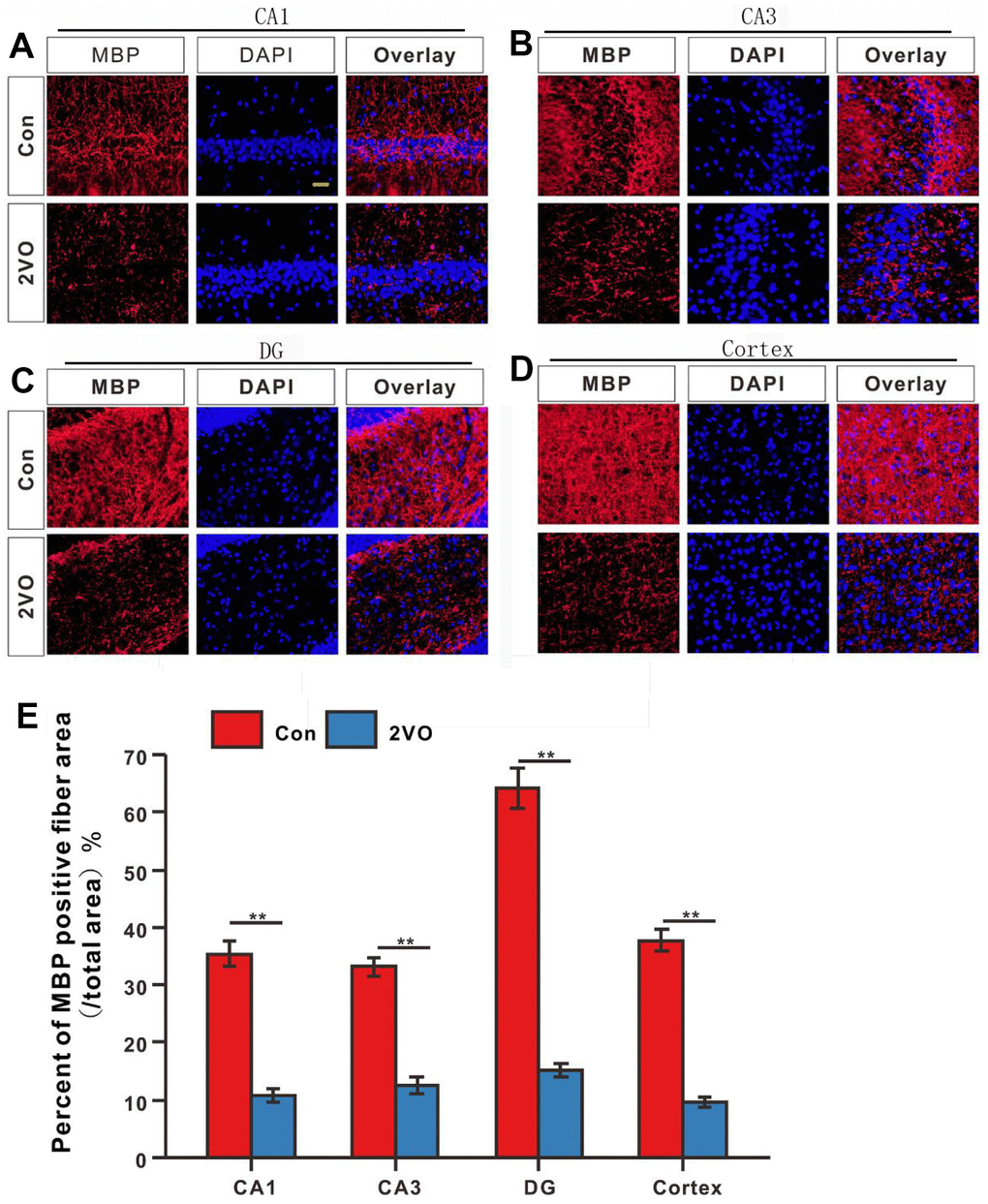 To further explore whether CCH induces the interactivity damage of neuronal axons, the MBP was detected with immunofluorescence. The MBP staining showed that the percent of MBP positive staining fiber area in CA1, CA3, DG, and cortex of 2VO (Figure 5A–5D), reduced dramatically than that in the Con group (P<0.01) (Figure 5E).