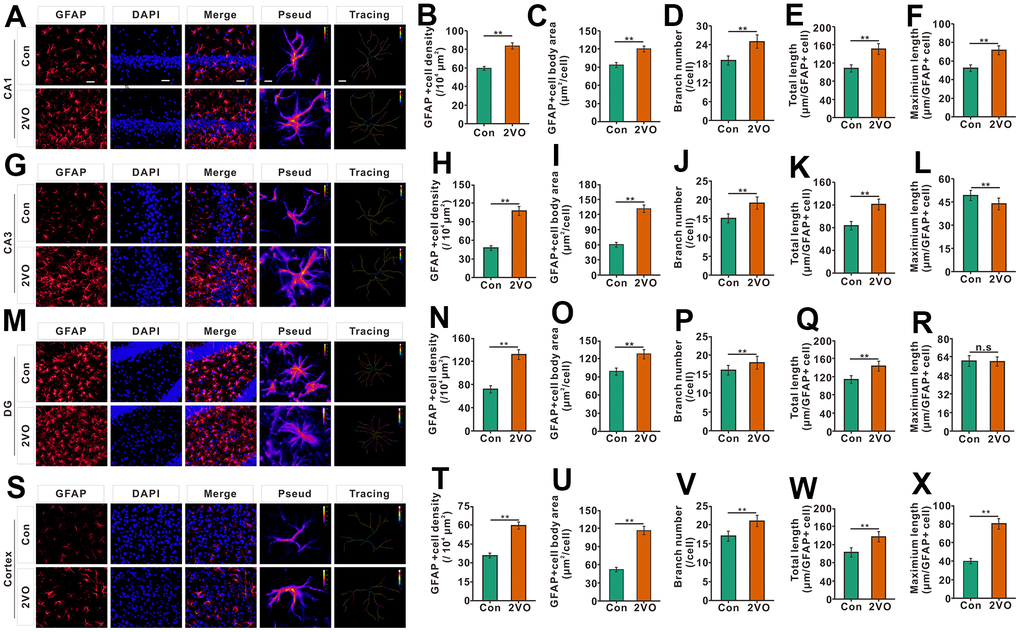 Neuroinflammation can be triggered by cerebral ischemia [28]. To explore whether CCH activates and proliferate astrocyte, the astrocytes were stained with glial fibrillary acidic protein (GFAP), a marker of astrocyte. The GFAP staining showed that the density of GFAP staining positive cells, the body area of GFAP staining positive cells, branch number, and total length of the project, in the CA1, CA3, DG, and cortex of the 2VO group, noticeably increased than that of the Con group (P<0.01) (Figure 6A–6E, 6G–6K, 6M–6Q, 6S–6W). In CA1 and cortex, the maximal length of projection in CA1 and cortex of 2VO, but not CA3 and DG, was remarkably greater than that of control group (P<0.01) (Figure 6F, 6L, 6R, 6X).