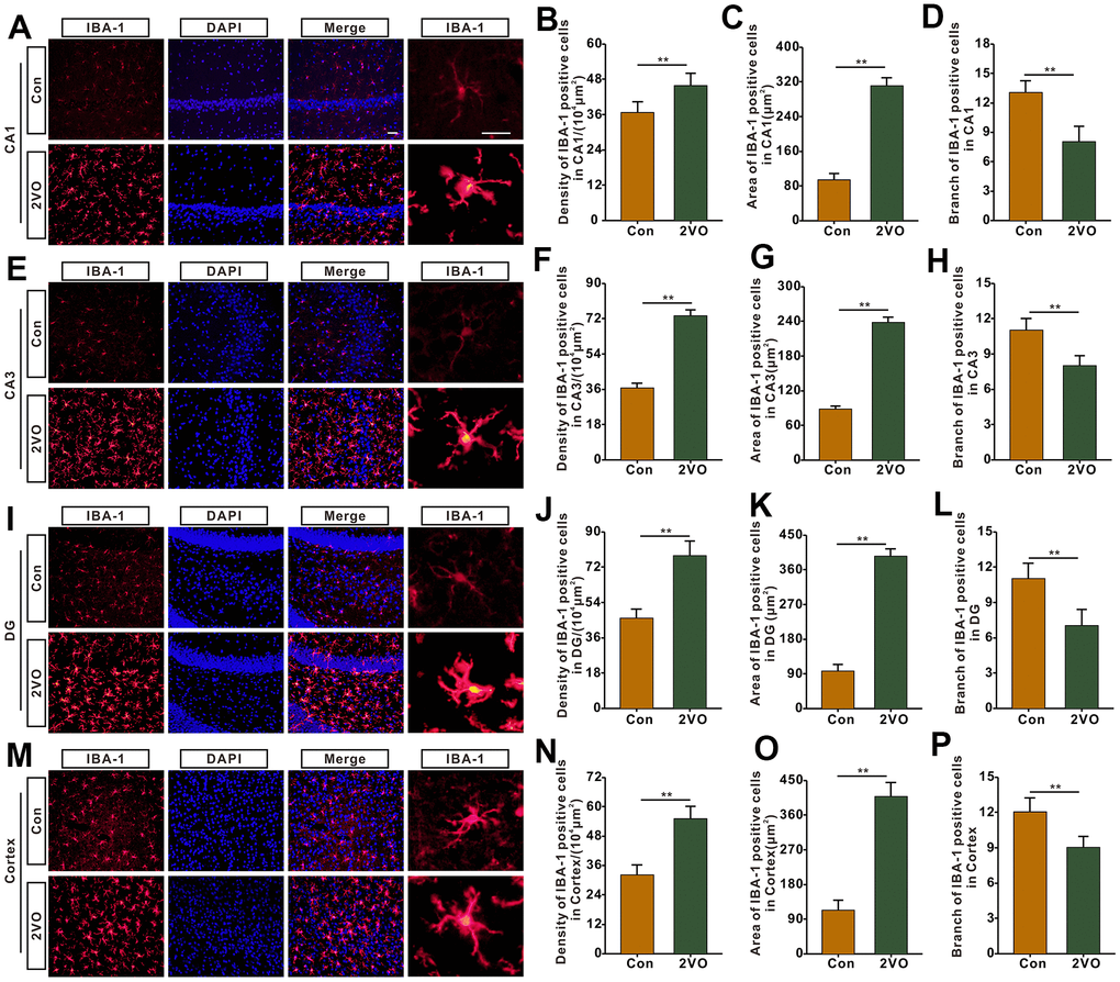 Microglia is one of the main kinds of inflammation cells in the brain. To further explore whether CCH activates and proliferates microglia, the brain slices were stained with IBA-1, a marker of microglia. The IBA-1 staining showed that the density and the body area of IBA-1 staining positive cells in CA1, CA3, DG, and cortex of the 2VO group, markedly increased than that of the Con group (P<0.01) (Figure 7A–7C, 7E–7G, 7I–7K, 7M–7O). And branch number of the CA1, CA3, DG, and hippocampus, was remarkably less than that of the Con group (P<0.01) (Figure 7D, 7H, 7L, 7P).