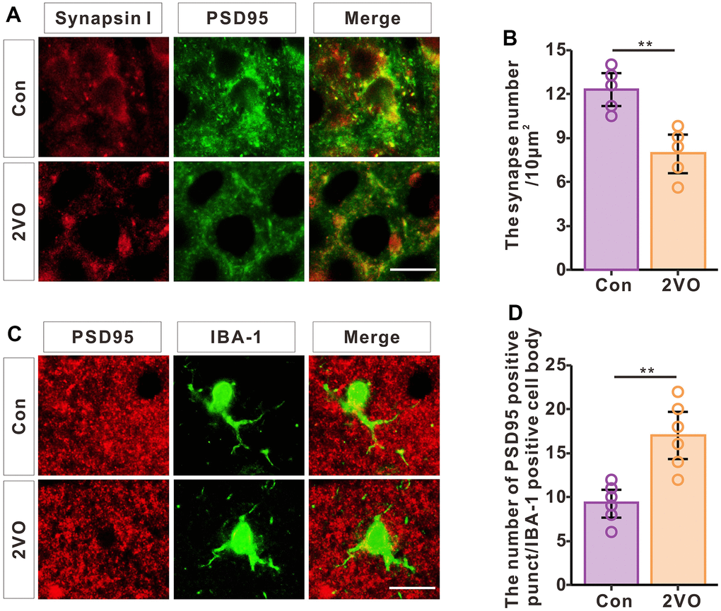To investigate synapse levels after CCH, the brain slice was stained with synapsin I and PSD-95 (Figure 8A). The immunofluorescence data showed that CCH dramatically decreased the density of synapses (P<0.01) (Figure 8B). To further explore whether the synapse loss was induced by phagocytosis of synapses from microglia, the brain slice was stained with PSD-95 and IBA-1 (Figure 8C). The immunofluorescence data showed that CCH dramatically increased the PSD-95 positive punct number of microglia’ cell body (P<0.01) (Figure 8D). These suggested that CCH activate the microglia to engulf the PSD-95 to contribute to the synapse loss.