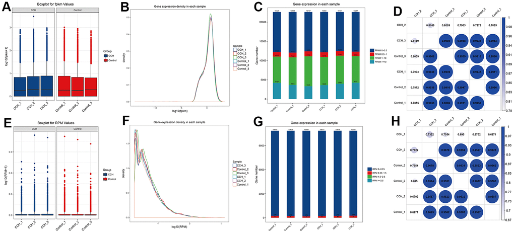 To determine whether the data from RNA sequencing of the different groups had less difference, FPKM bases and RPM bases were analyzed. The data showed that the absolute FPKM value (log10(PFKM)) and RPM value (log10(RPM)) in the CCH and Con groups had no noticeable difference (Figure 9A, 9E). To further investigate the distribution of FPKM and RPM, both the density of log10(FPKM) and log10(RPM) had a highly consistent distribution (Figure 9B, 9F). Moreover, the gene numbers in different FPKM and RPM values were almost near (Figure 9C, 9G). Besides, the correlation analysis showed that FPKM and RMP values in different groups were highly correlated (Figures 9D, 8H). These suggested that the sequencing data from the different groups in the CCH and Con groups had high homogeneity suitable to be further analyzed.