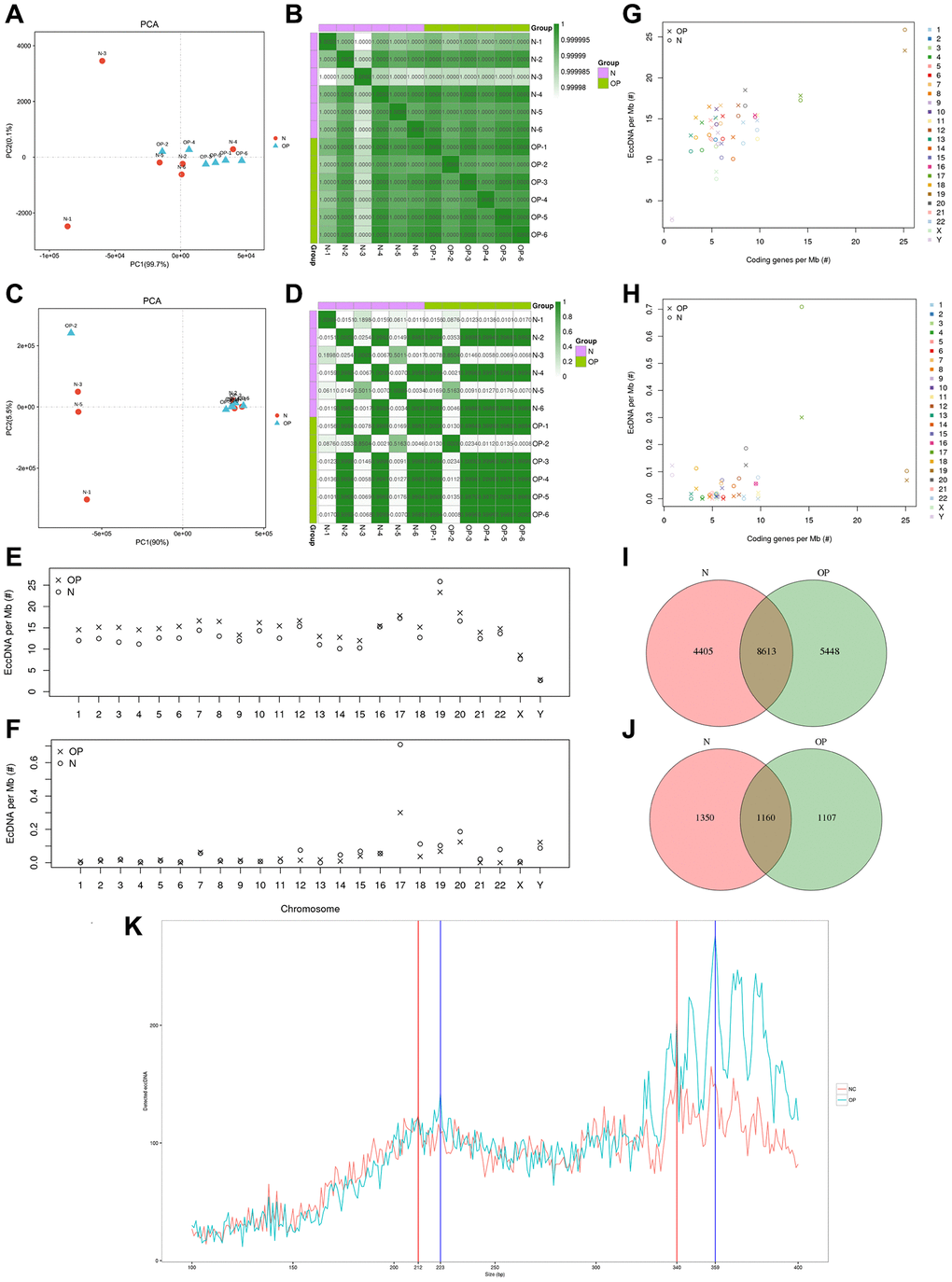 Based on the expression of known genes in each sample, a principal component analysis (PCA) was performed using the R platform (http://www.r-project.org/) to research the distance relationship between samples. The eccDNA/ecDNA expression level in any two samples was used to calculate the Pearson correlation coefficient between each two samples (Figure 2A, 2B). The PCA and Pearson analysis results showed that the osteoporosis group had higher sample similarity than the normal group (Figure 2C, 2D). We analysed the length distribution of eccDNA in the osteoporosis samples and normal samples and identified two main peaks at 223 bp and 359 bp in the OP group and at approximately 212 bp and 340 bp in the normal group (Figure 2K). The amount of eccDNA per Mb in each pair of chromosomes showed that the OP group was generally larger than the normal group except on chromosome 19. The amount of eccDNA per Mb on chromosome 19 was higher than that on other chromosomes, and the amount on the Y chromosome was lower than that on other chromosomes (Figure 2G, 2H). The frequency of ecDNA per Mb of chromosomes in the OP group was not higher than that in the normal group, although the frequency of ecDNA per Mb on chromosome 17 was significantly higher than that on the other chromosomes (Figure 2F). The results are consistent with those previously detected in normal human muscle and blood [7]. Similarly, the coding eccDNAs/Mb and genes/Mb percentages on chromosomes 17 and 19 were significantly higher than those on the other chromosomes (Figure 2E). The same was true for ecDNA (Figure 2F).